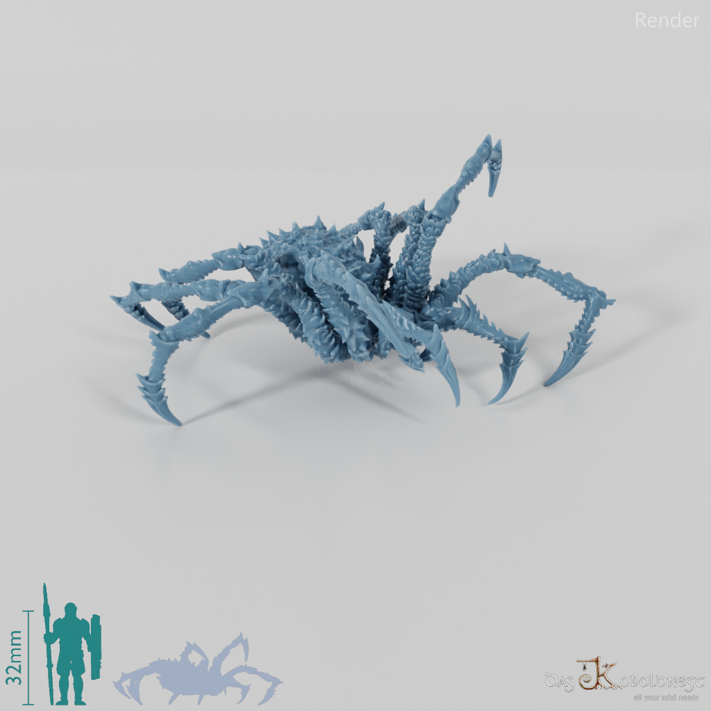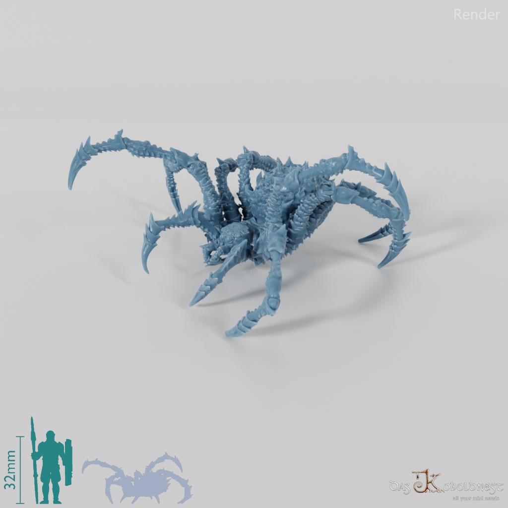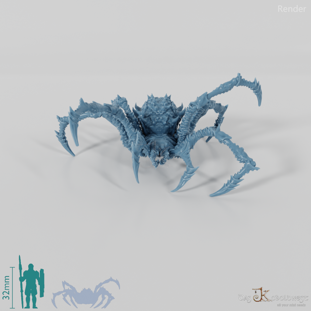 Riesenspinne mit stacheligem Körper und Beinen. Modell passt knapp auf eine 40mm-Rundbase und bequem auf 50- und 60mm-Rundbases.