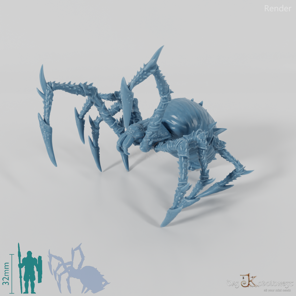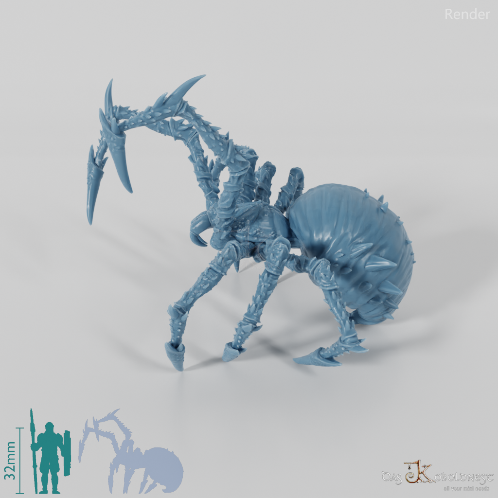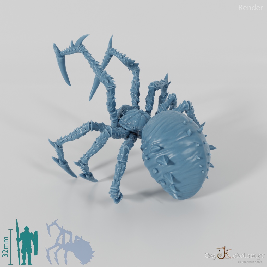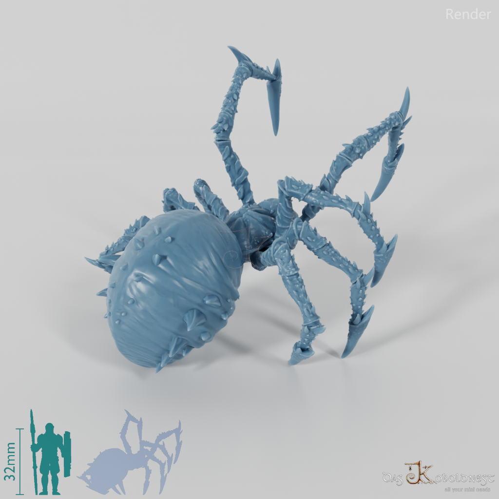 Riesenspinne mit glattem, dornigem Körper und Beinen. Modell passt knapp auf eine 40mm-Rundbase und bequem auf 50- und 60mm-Rundbases.