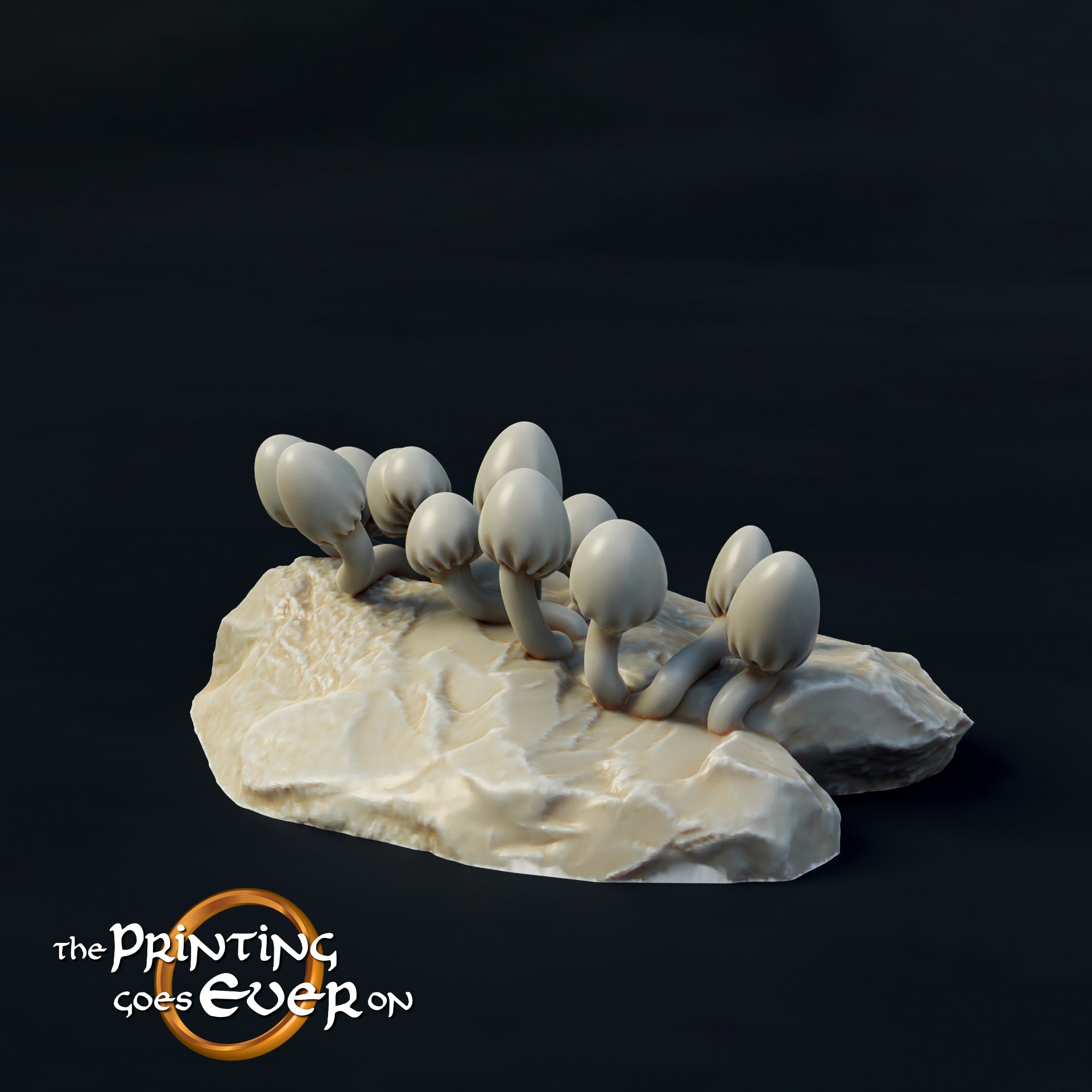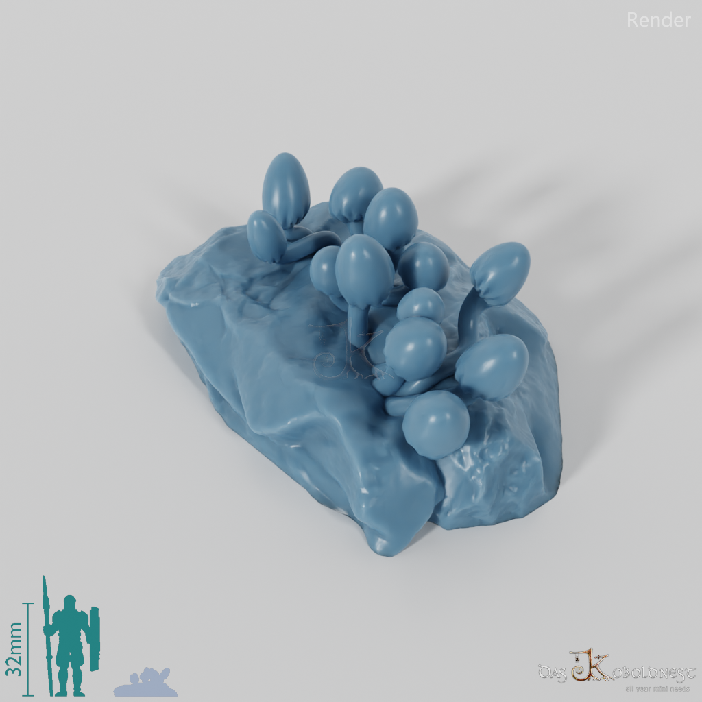 Kleiner Fels, aus dessen Spalte ein Cluster von kleinen Pilzen herauswächst
