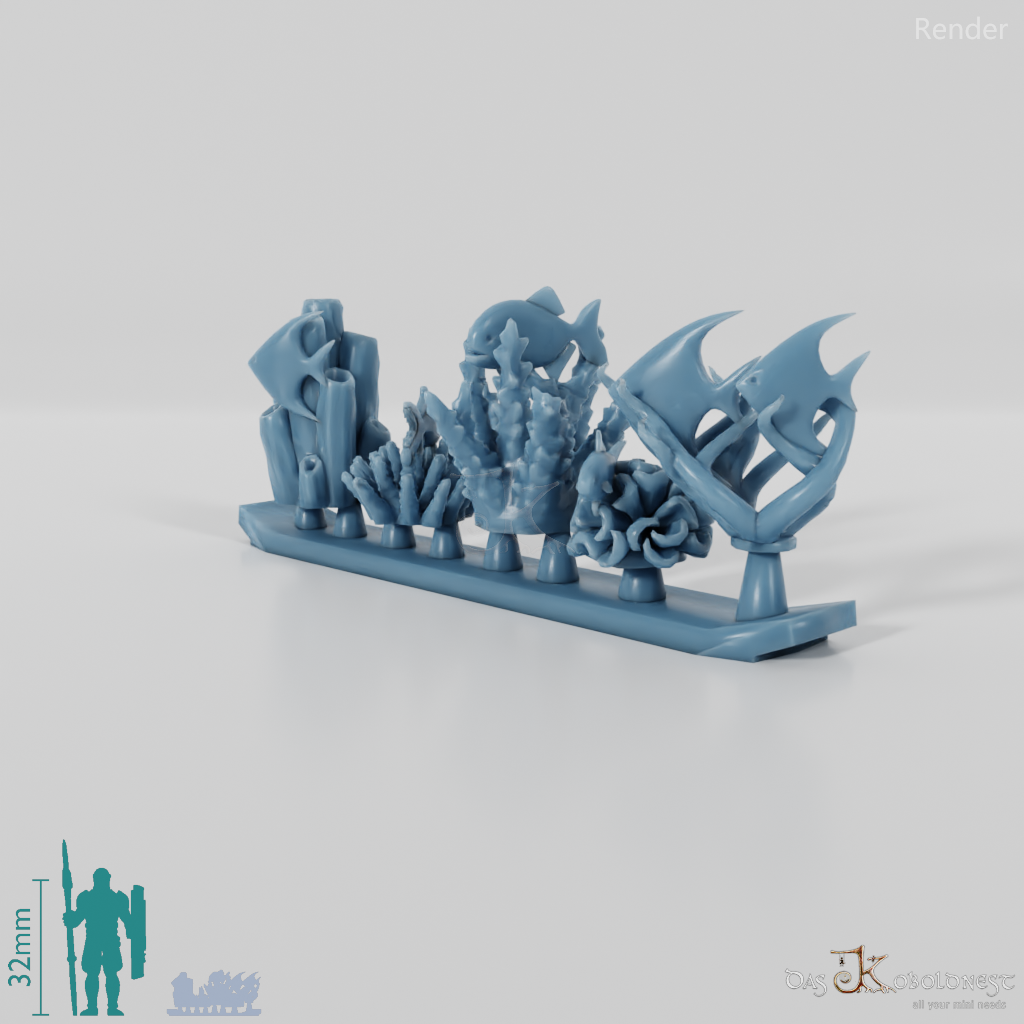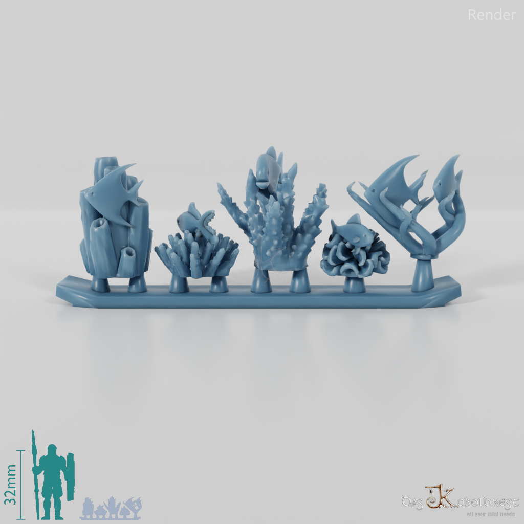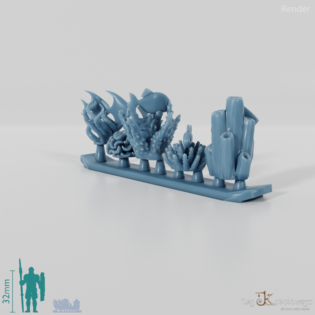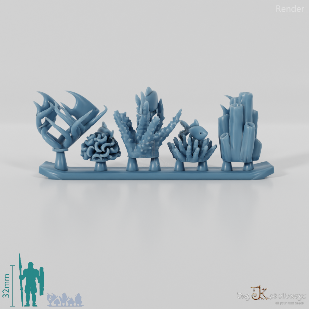 Fünf verschiedene Korallen, Schwämme und andere Riffpflanzen Die Modelle werden in zusammenhängendem Rahmen geliefert und müssen beispielsweise mit einem Bastelmesser abgetrennt werden. Model by Pellinor1, licensed under CC BY 4.0