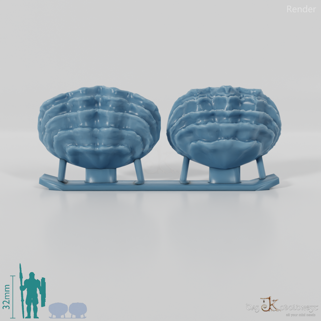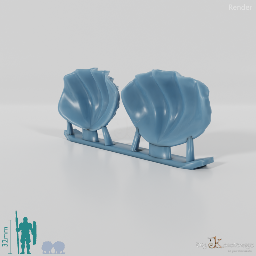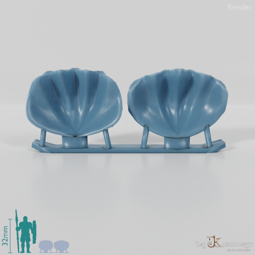 Zwei Muschelhälften, die auch zu einer vollständigen Muschel zusammengesetzt werden können Die Modelle werden in zusammenhängendem Rahmen geliefert und müssen beispielsweise mit einem Bastelmesser abgetrennt werden. Model by Pellinor1, licensed under CC BY 4.0