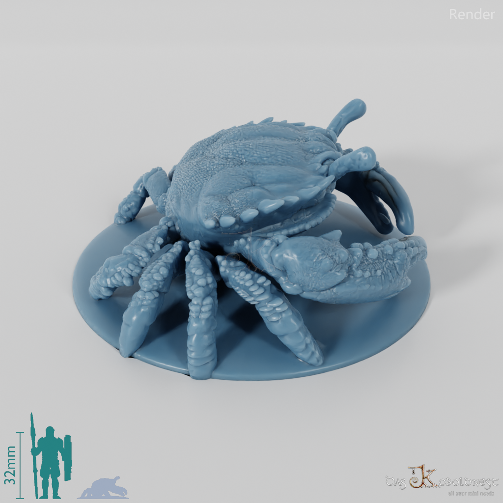 Große, sechsbeinige Krabbe mit zwei großen Scheren, die auf einer einfachen Base mit 25mm Durchmesser sitzt.