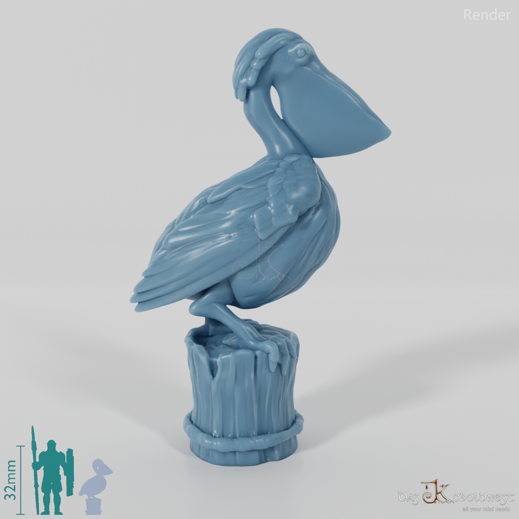 Pelikan, der auf einem dicken, mit einem Seil umwickelten Holzpfahl sitzt
