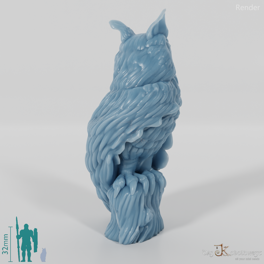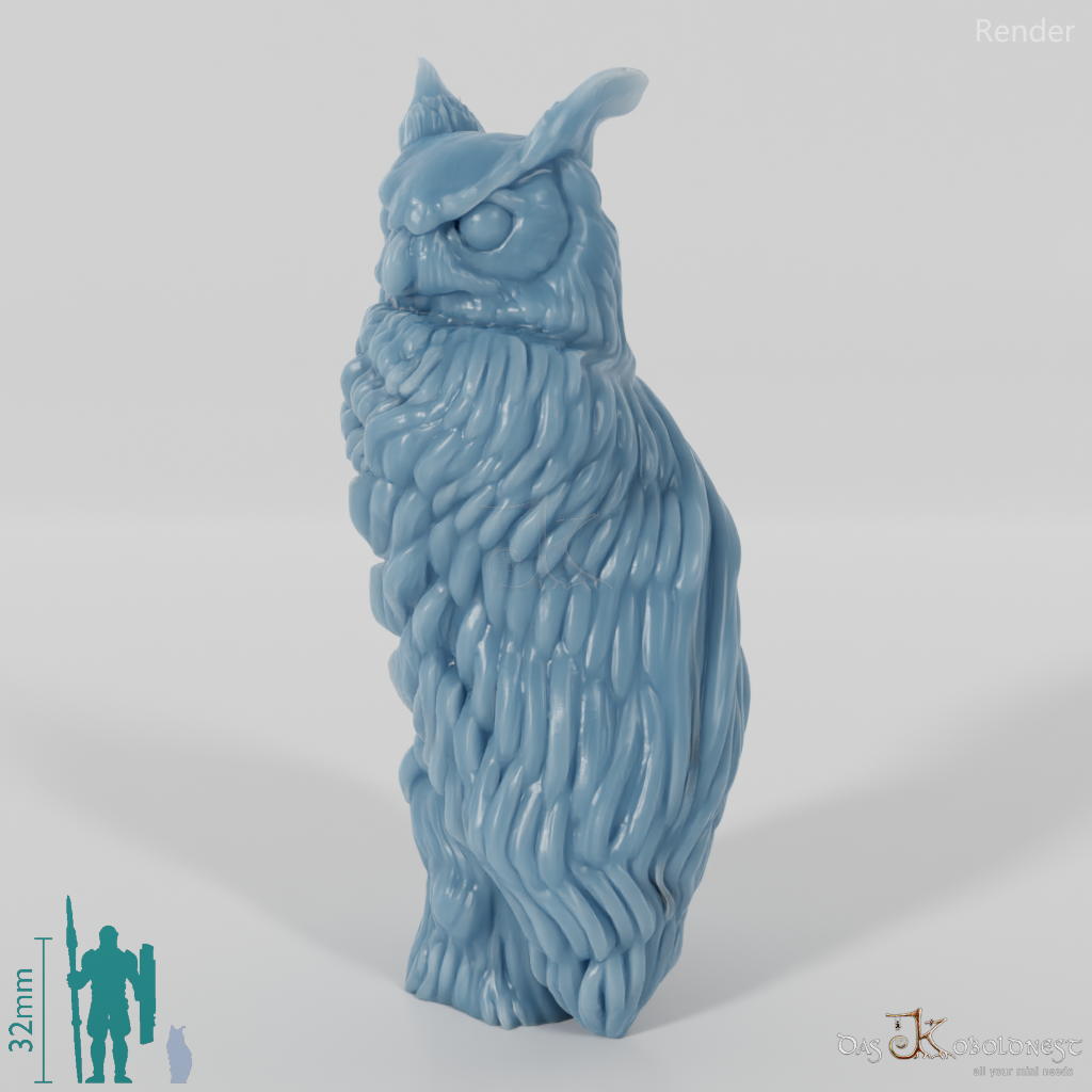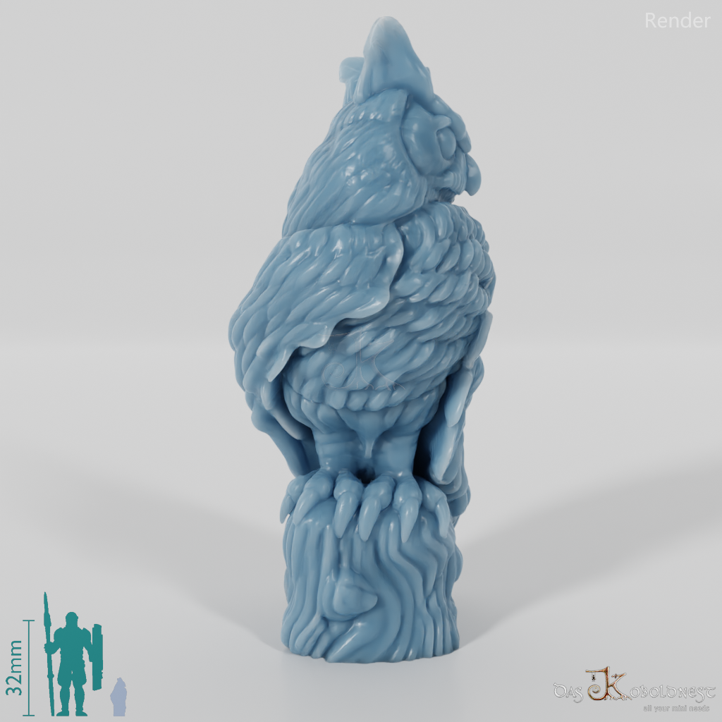 Virginia-Uhu (Bubo virginianus) auf einem Baumstamm sitzend. Modell: Great Horned Owl by bennettklein, lizenziert unter CC BY-SA 3.0.