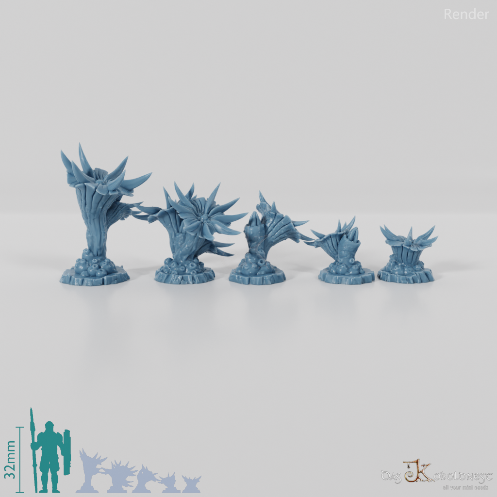 Die Auswahl 'Komplettset (Groß)' beinhaltet alle fünf großen Einzelmodelle. Die Auswahl 'Komplettset (Klein)' beinhaltet alle fünf Modelle, jedoch im Vergleich zu den Einzelmodellen deutlich verkleinert, sodass sie als kleine Pflanzen zur Base- oder Dioramagestaltung verwendet werden können.