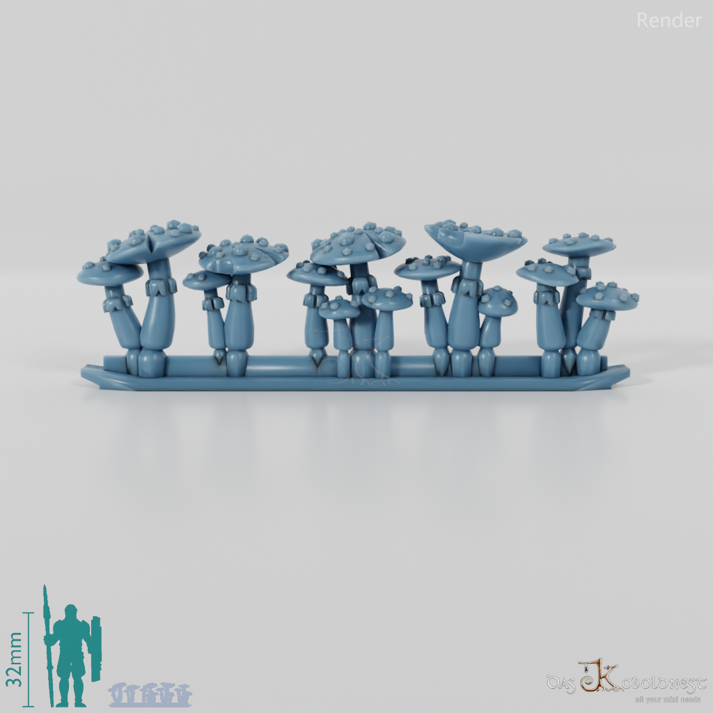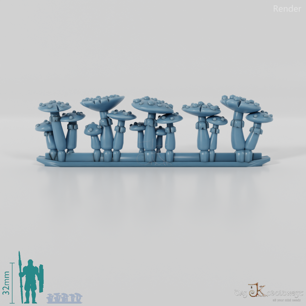 Fünf kleine Pilzgruppen Die Modelle werden in zusammenhängendem Rahmen geliefert und müssen beispielsweise mit einem Bastelmesser abgetrennt werden. Model by Pellinor1, licensed under CC BY 4.0