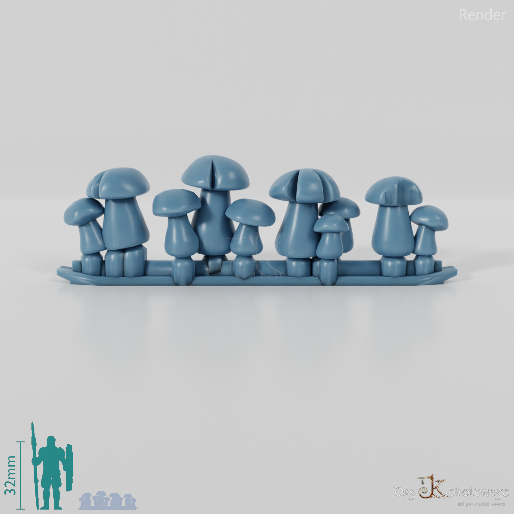 Vier kleine Pilzgruppen Die Modelle werden in zusammenhängendem Rahmen geliefert und müssen beispielsweise mit einem Bastelmesser abgetrennt werden. Model by Pellinor1, licensed under CC BY 4.0