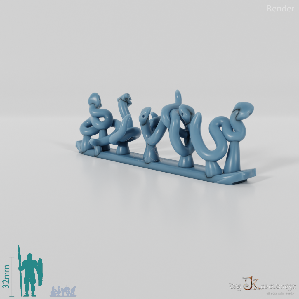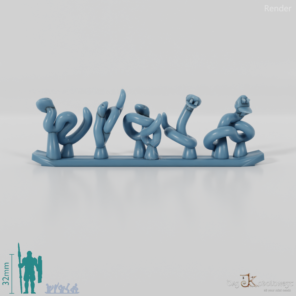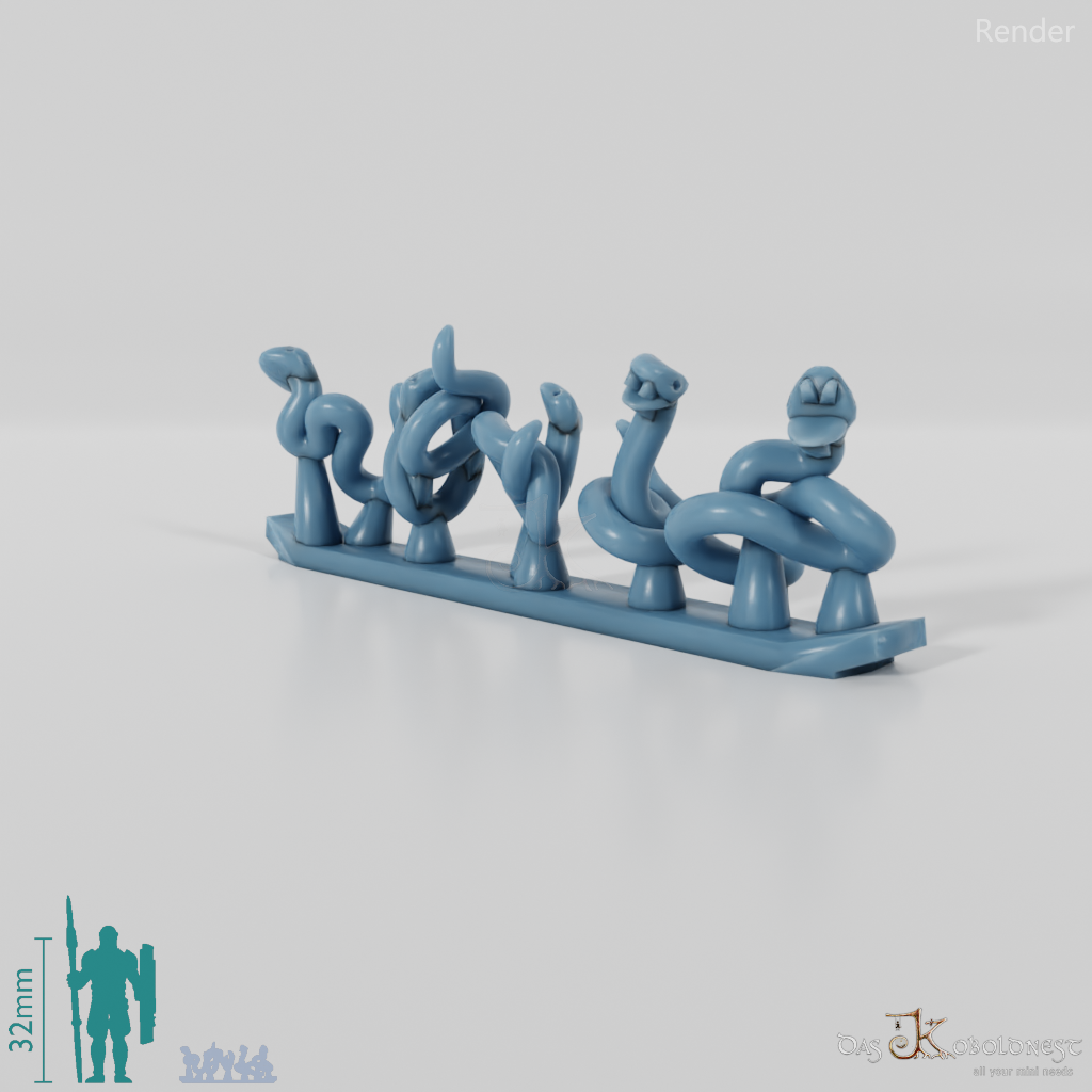 Fünf unterschiedliche, kleine Schlangen Die Modelle werden in zusammenhängendem Rahmen geliefert und müssen beispielsweise mit einem Bastelmesser abgetrennt werden. Model by Pellinor1, licensed under CC BY 4.0