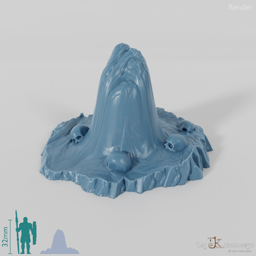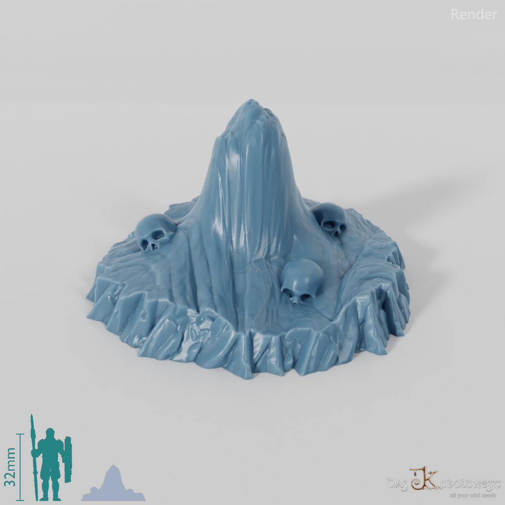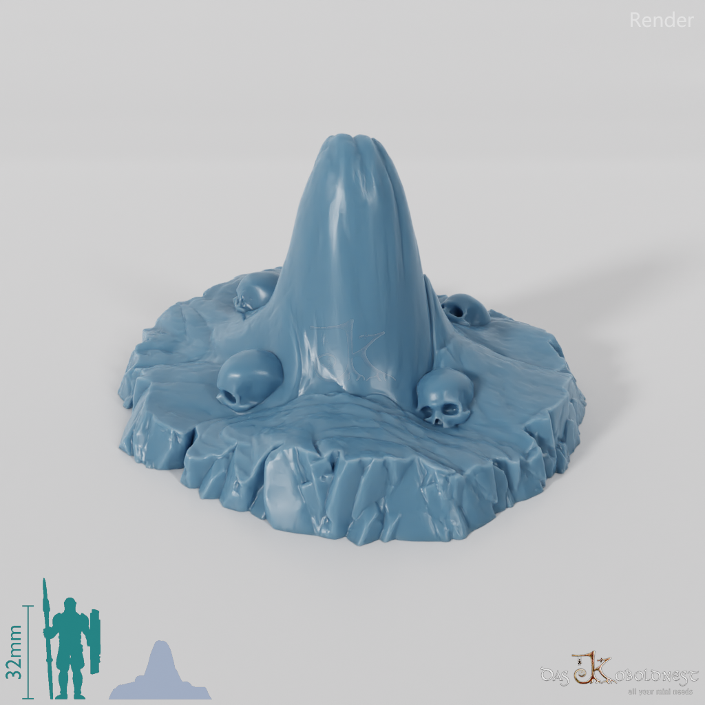 Runde, im Erkalten begriffene Lavaformation, um die herum viele Menschenschädel liegen
