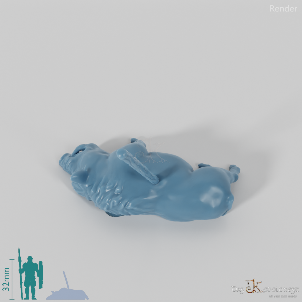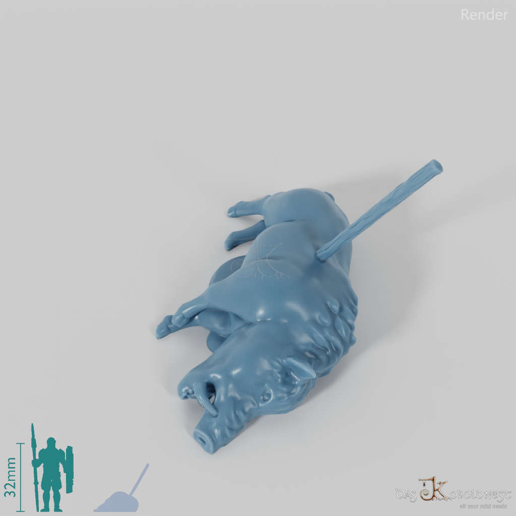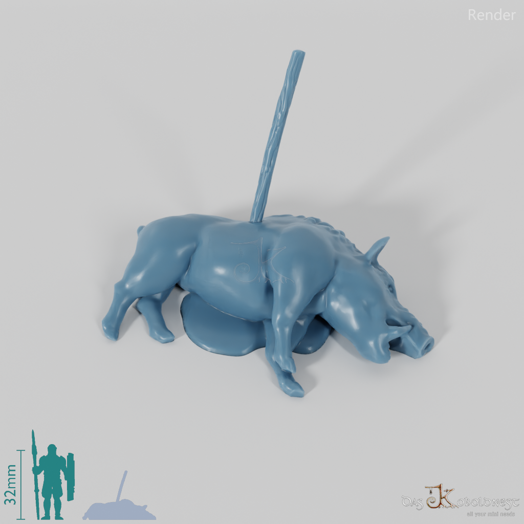 Von einem Speer erlegtes Schwein, das in einer Blutlache liegt.