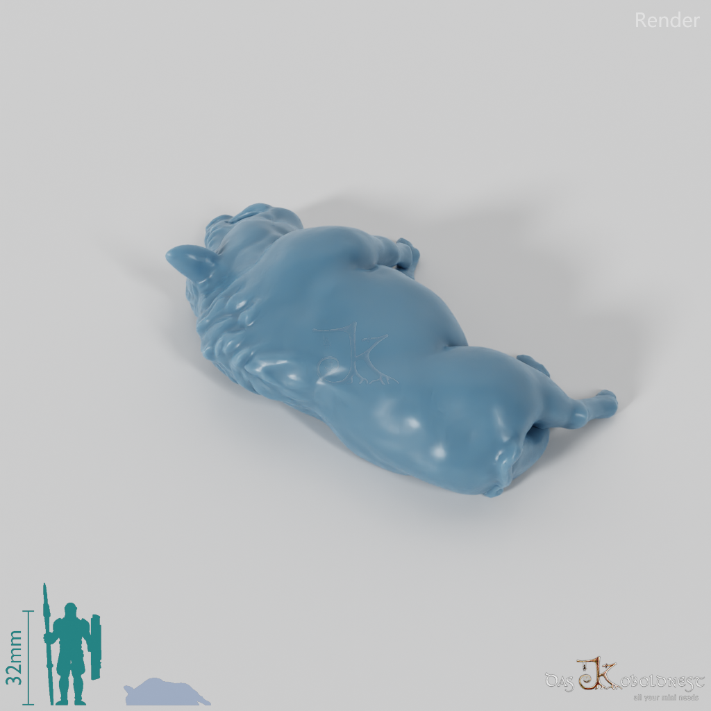 Totes, am Boden liegendes Schwein mit großen Hauern.