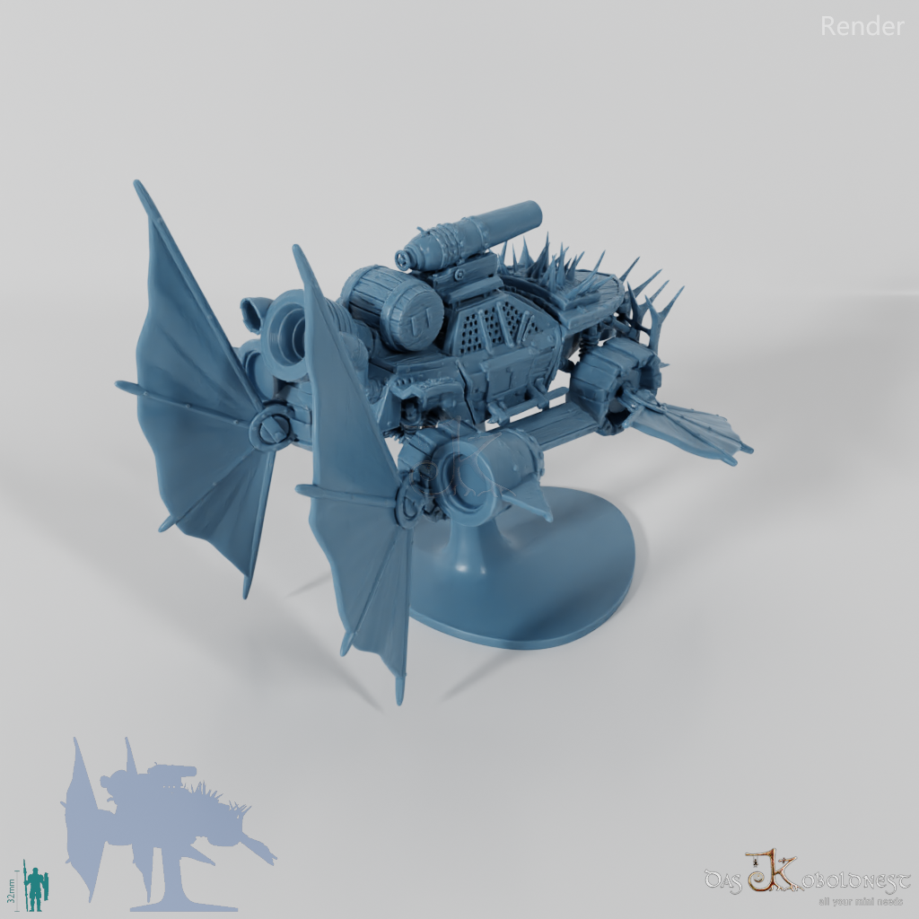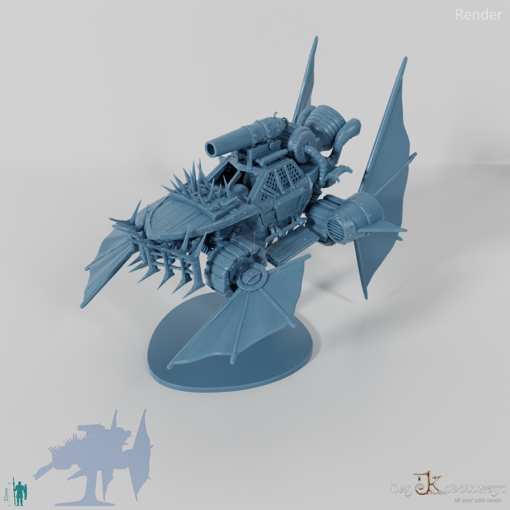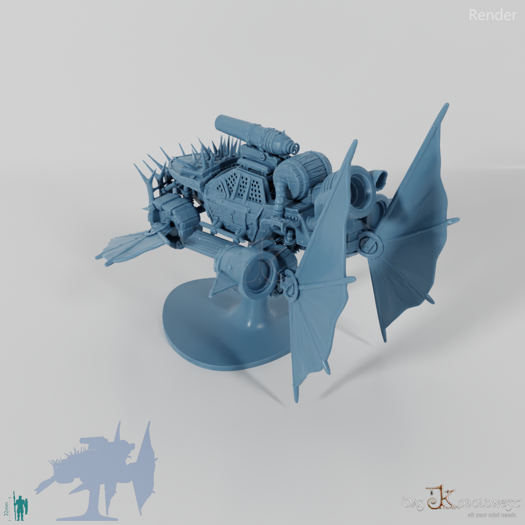 Aus Metallschrott und Holzresten zusammengebaute Luftschiff mit Segelflügeln, stachelbewehrter Rüstung, riesigem Auspuff und auf dem Dach montierter Kanone