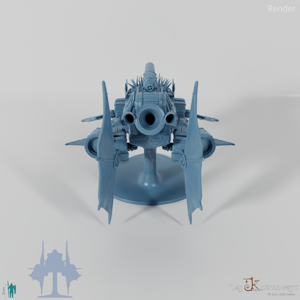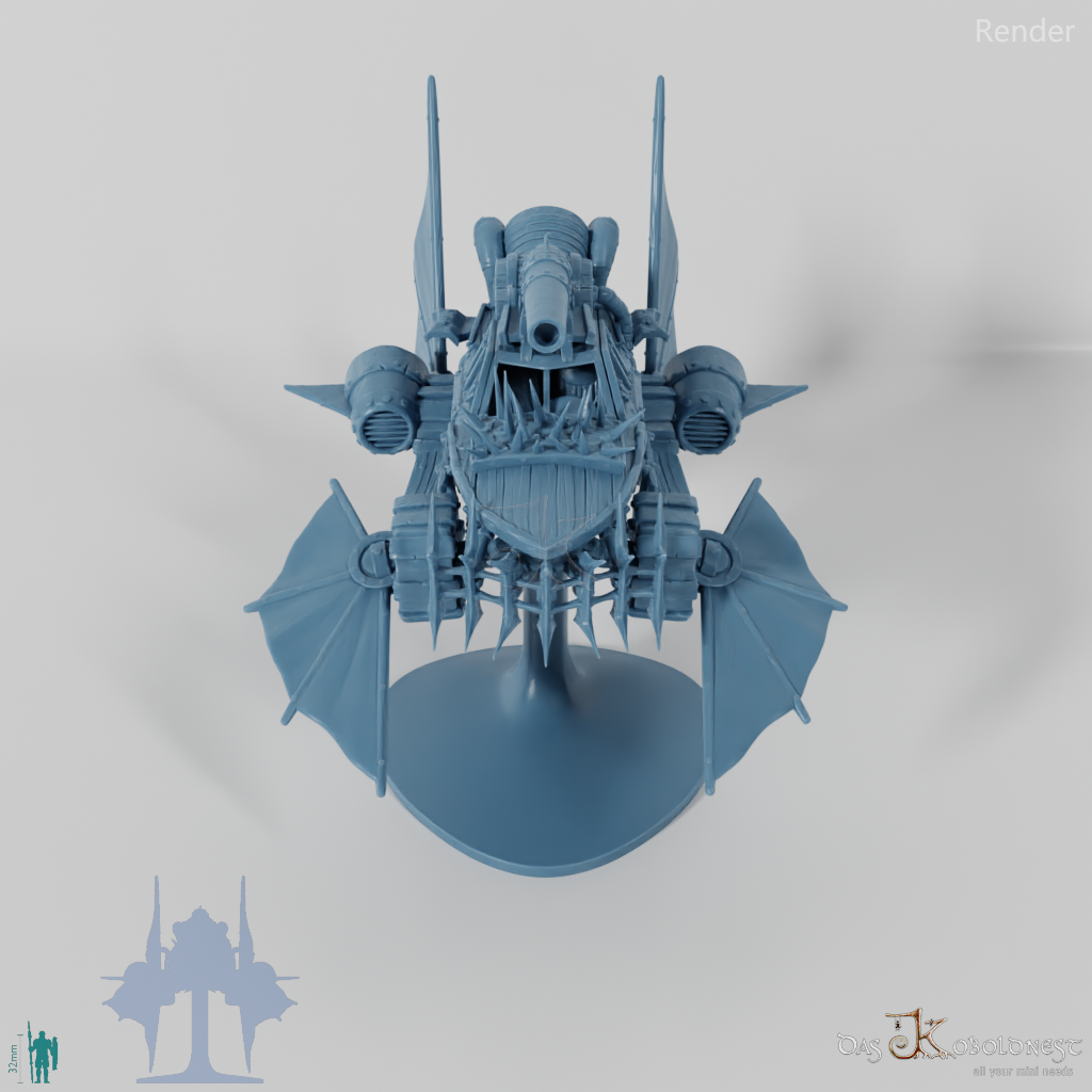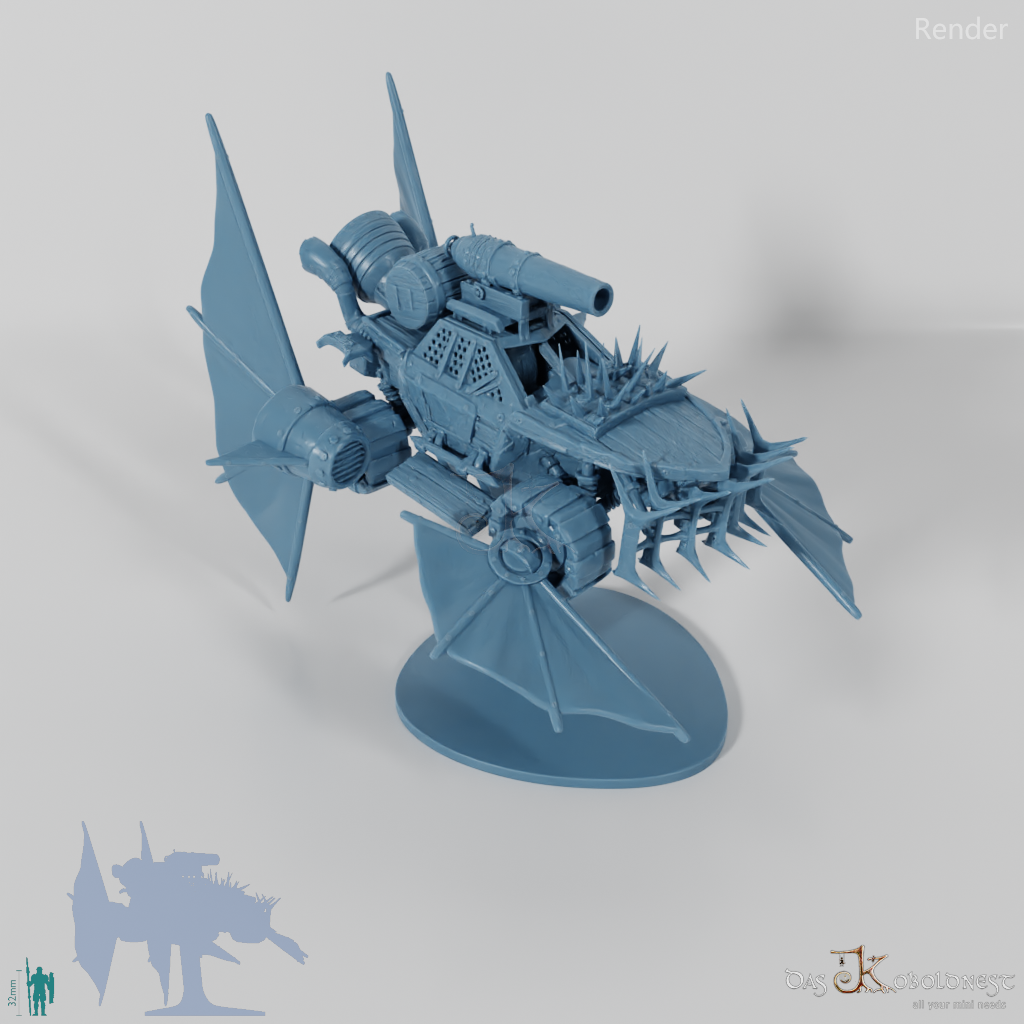Aus Metallschrott und Holzresten zusammengebaute Luftschiff mit Segelflügeln, stachelbewehrter Rüstung, riesigem Auspuff und auf dem Dach montierter Kanone