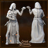 Hohepriester mit erhobenem Dolch, der vor einer gefesselten Gestalt in Bandagen auf einem Altar steht. Artikel besteht aus Opferpriester, Altar und Opfer