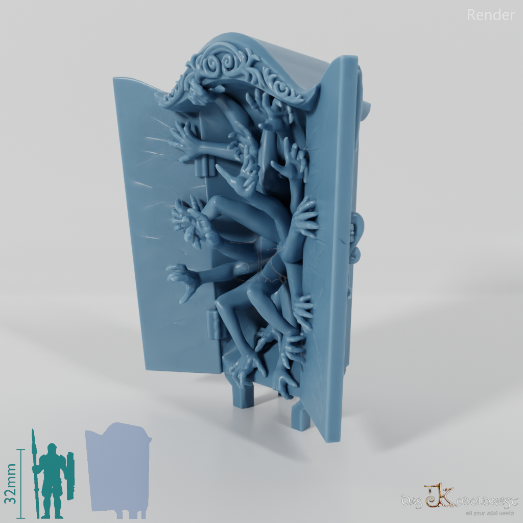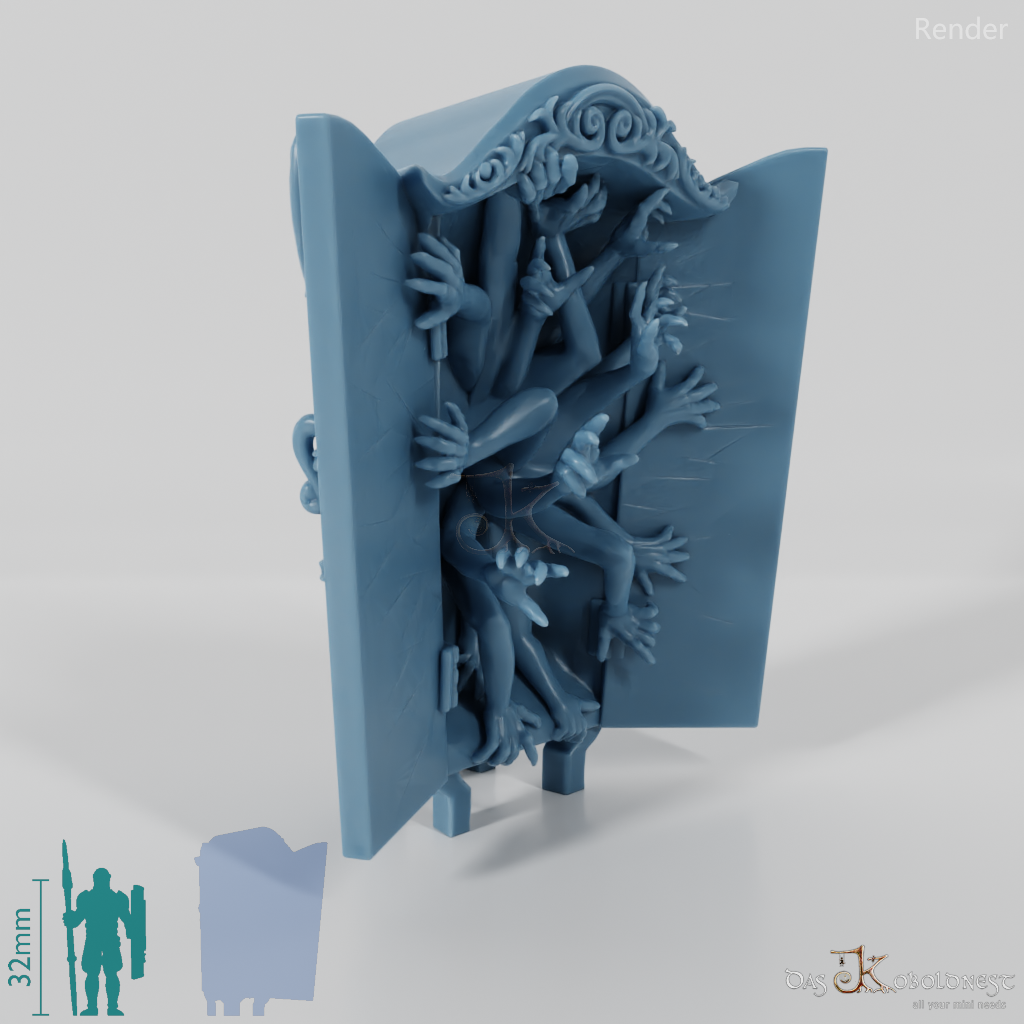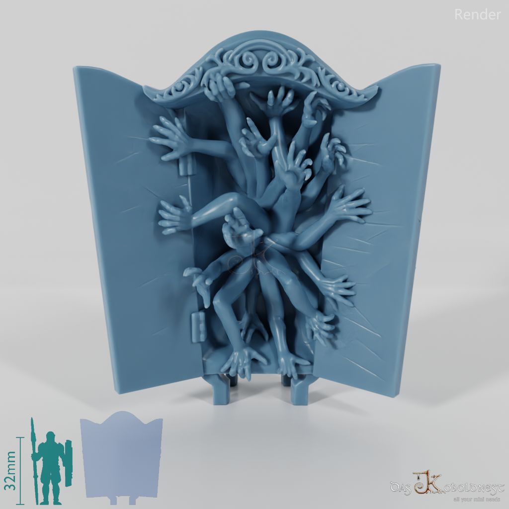 Großer, offen stehender Wandschrank, aus dessen dunklem Inneren unzählige Arme herausgreifen und an den Schrankwänden kratzen. Auch als geschlossener Wandschrank verfügbar. "The pitter-patter of tiny bare feet is echoing through the gloomy halls of Scarweald Manor. The young heiress holds her Cuddle Bunny tight and makes her way deeper into the castle chambers. Daddy told her that mommy is too sick and needs some good rest. Daddy told her he will take care of mommy. But why does it take them so long? Why was she forbidden from leaving the manor? Daddy is working every hour of every day and night and rarely comes to kiss his heiress goodnight. He tells her she is completely safe within the manor walls... then why does it feel like she’s trapped here, like darkness is closing in on her? Why does she shiver at night from the slightest noise? Is it just shadows playing tricks on her? Does she really hear things? Does she really SEE things? ...clutching her Cuddling Bunny even tighter, Little girl steps into the long dark corridor. Tonight she will find out the truth, whatever the cost..."