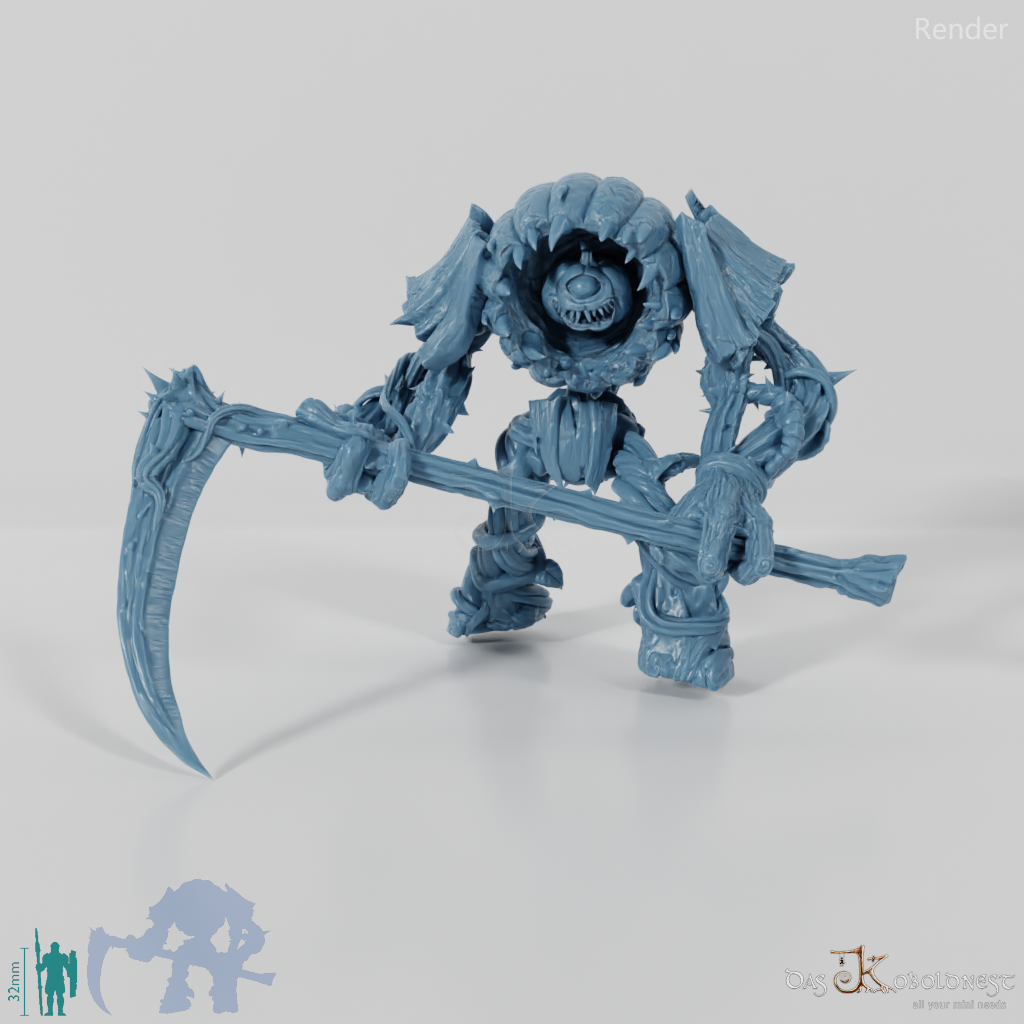 "Many abandoned farmsteads are now the breeding grounds for these malevolent creatures, which are naturally adept at blending into the scenery, taking over farms and making these now abandoned plots of land their home. Travelers rarely bother to approach or interfere with these farmsteads, which have long since been the graves of the poor farmers that used to live on the premises. These breeding patches, while they may at first seem abandoned, are patrolled by Patch Sentinels - humanoid looking creatures with pumpkin heads that can easily disguise themselves as scarecrows, or lie in the ground to disguise themselves amongst the pumpkins that naturally grow in these patches. Patch sentinels are fiercely territorial, and will not hesitate to cut down any wanderers who are unfortunate enough to step onto these breeding grounds where young pumpklings are born and matured."