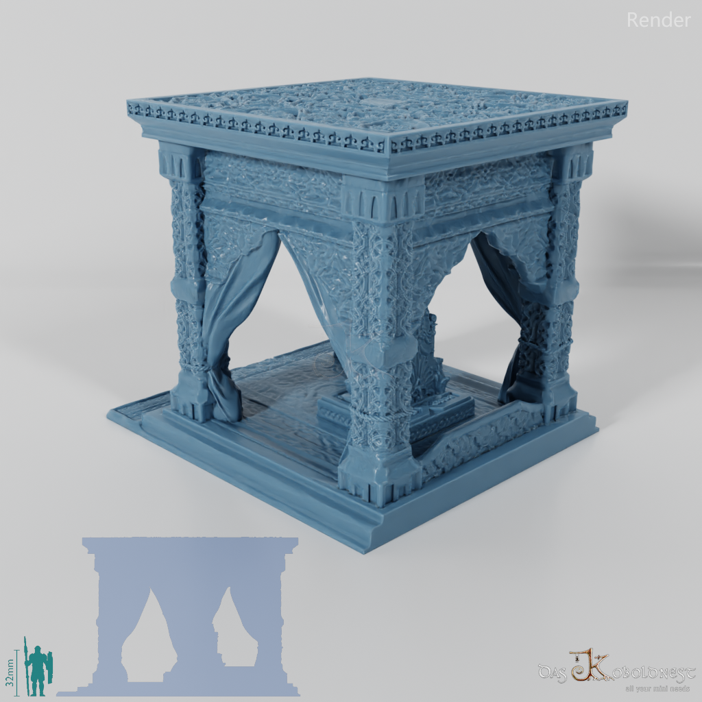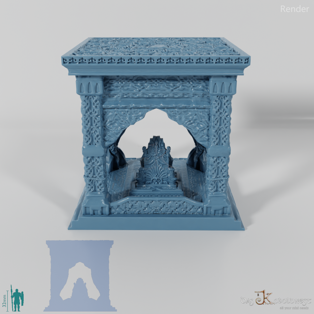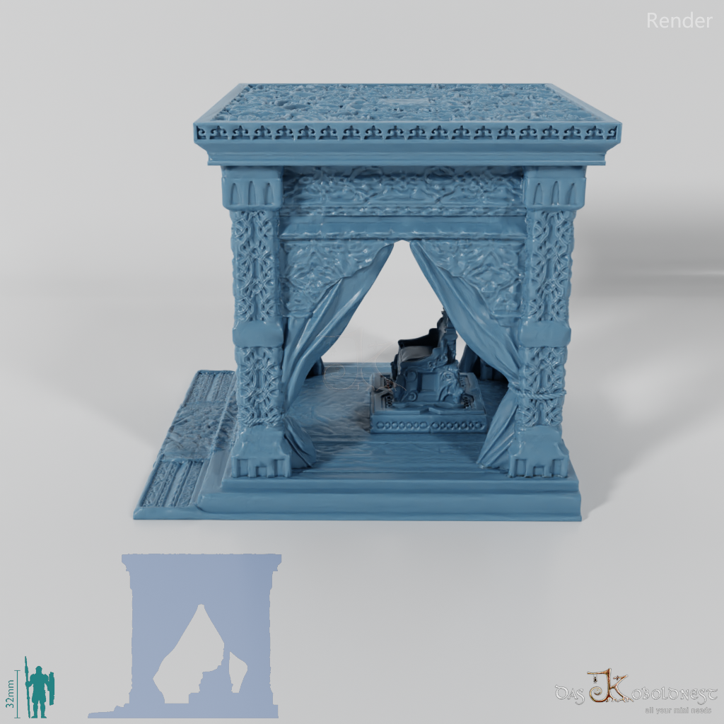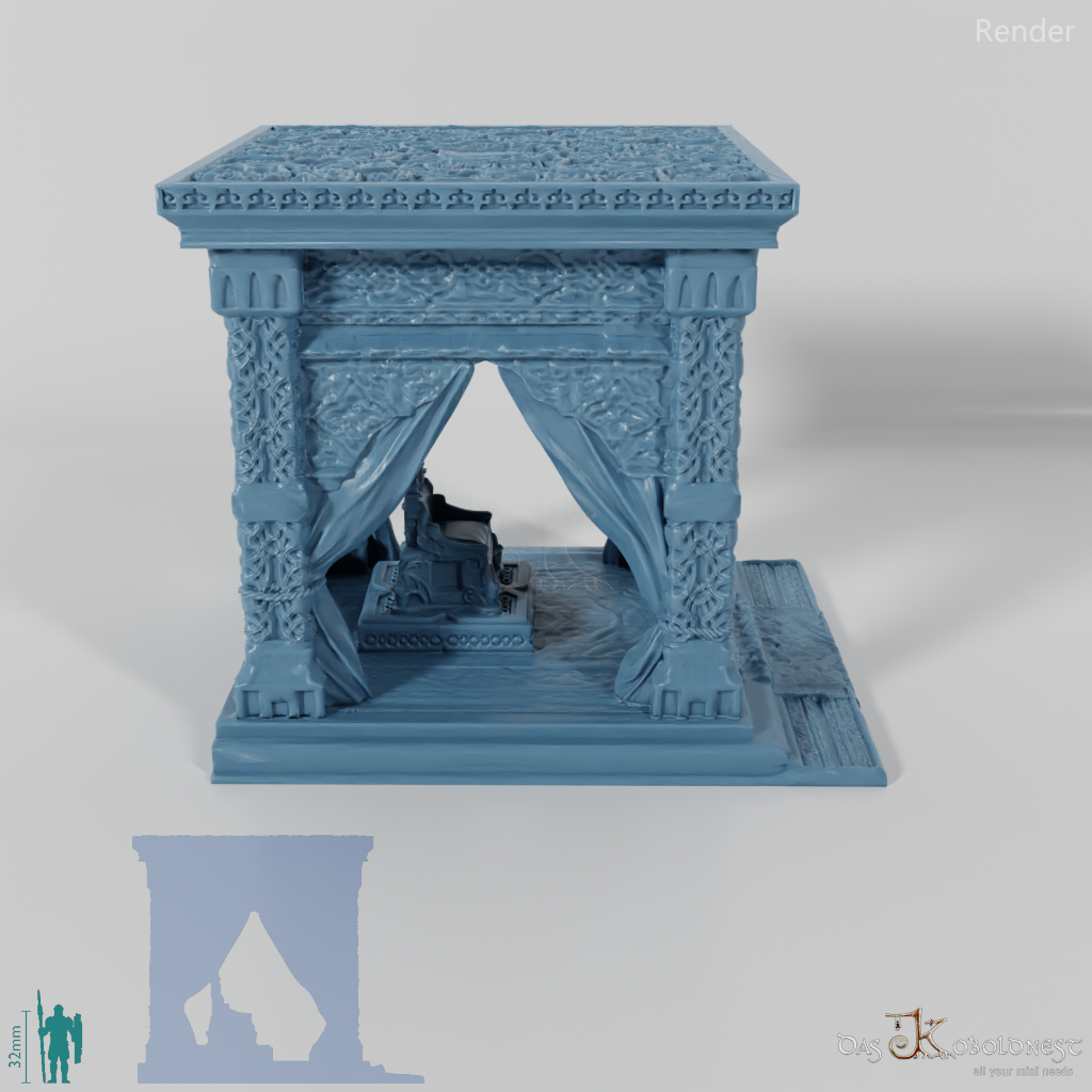 Reich verzierter, opulenter Pavillon mit edlem Thron auf einem Podest. Der Pavillon wird aus PLA gedruckt, der Thron aus Resin