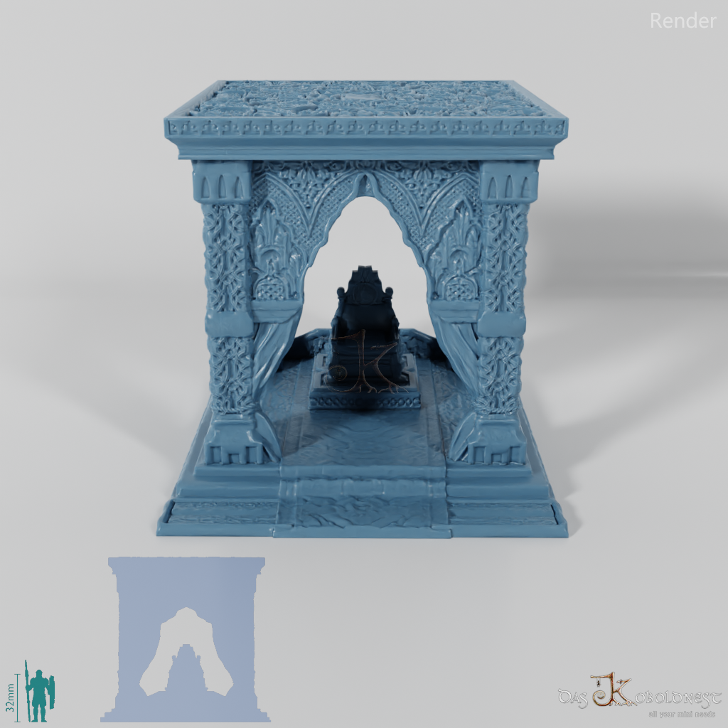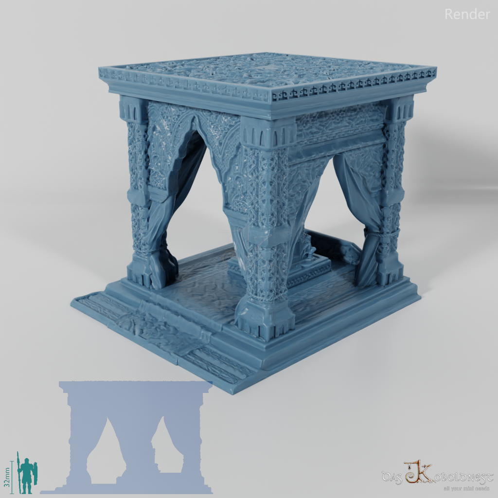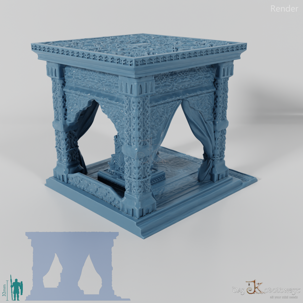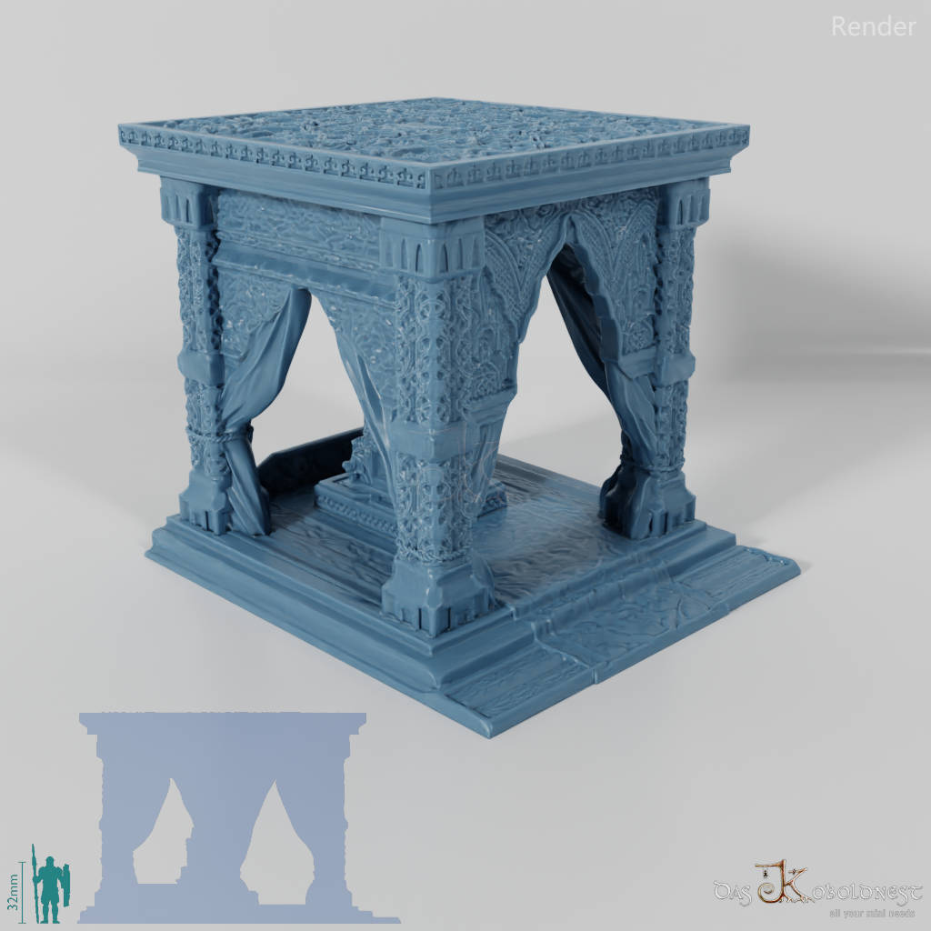 Reich verzierter, opulenter Pavillon mit edlem Thron auf einem Podest. Der Pavillon wird aus PLA gedruckt, der Thron aus Resin