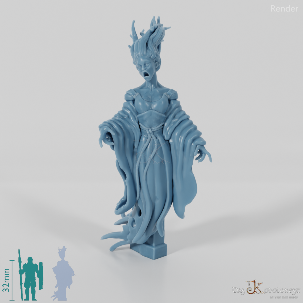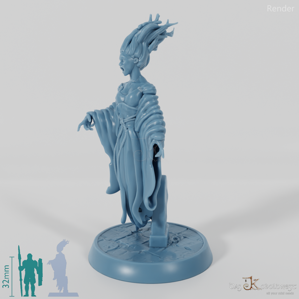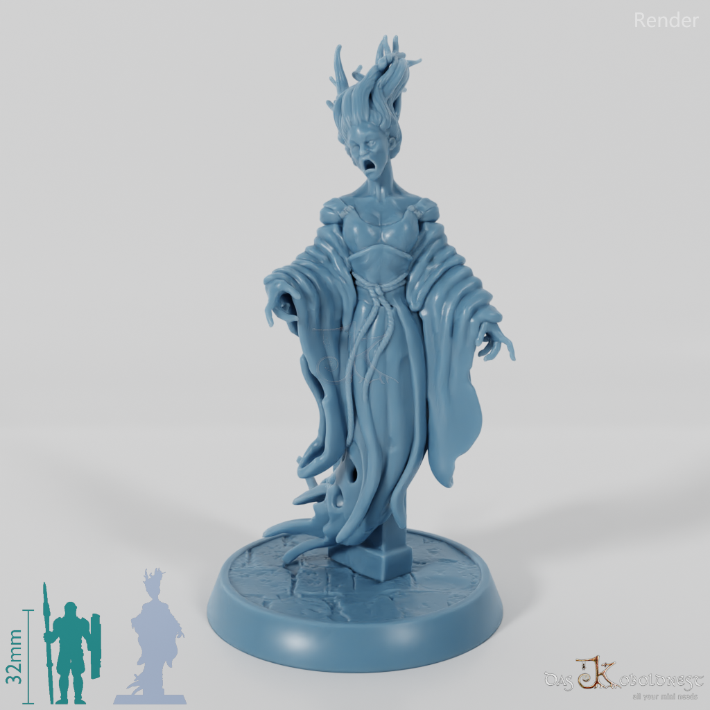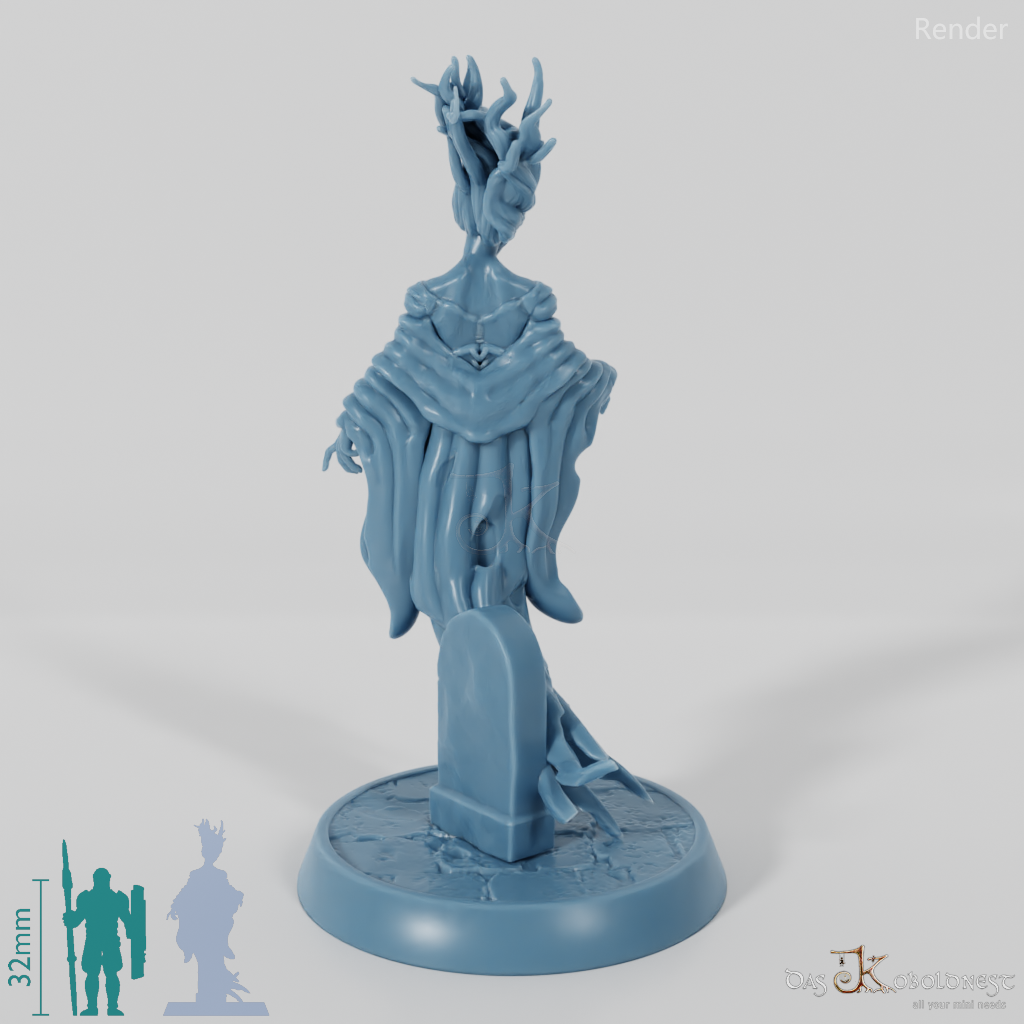 Weiblicher Klagegeist mit langen Haaren, der vor einem Grabstein schwebt.