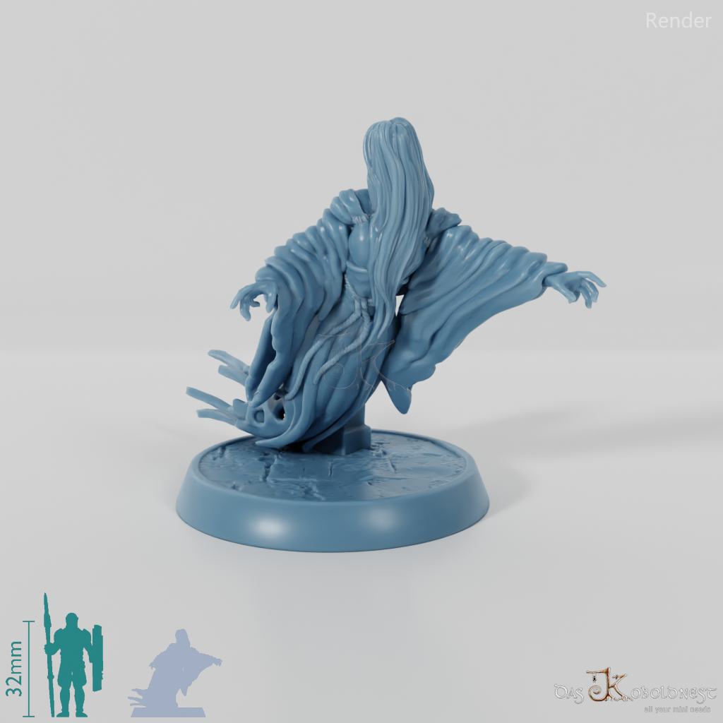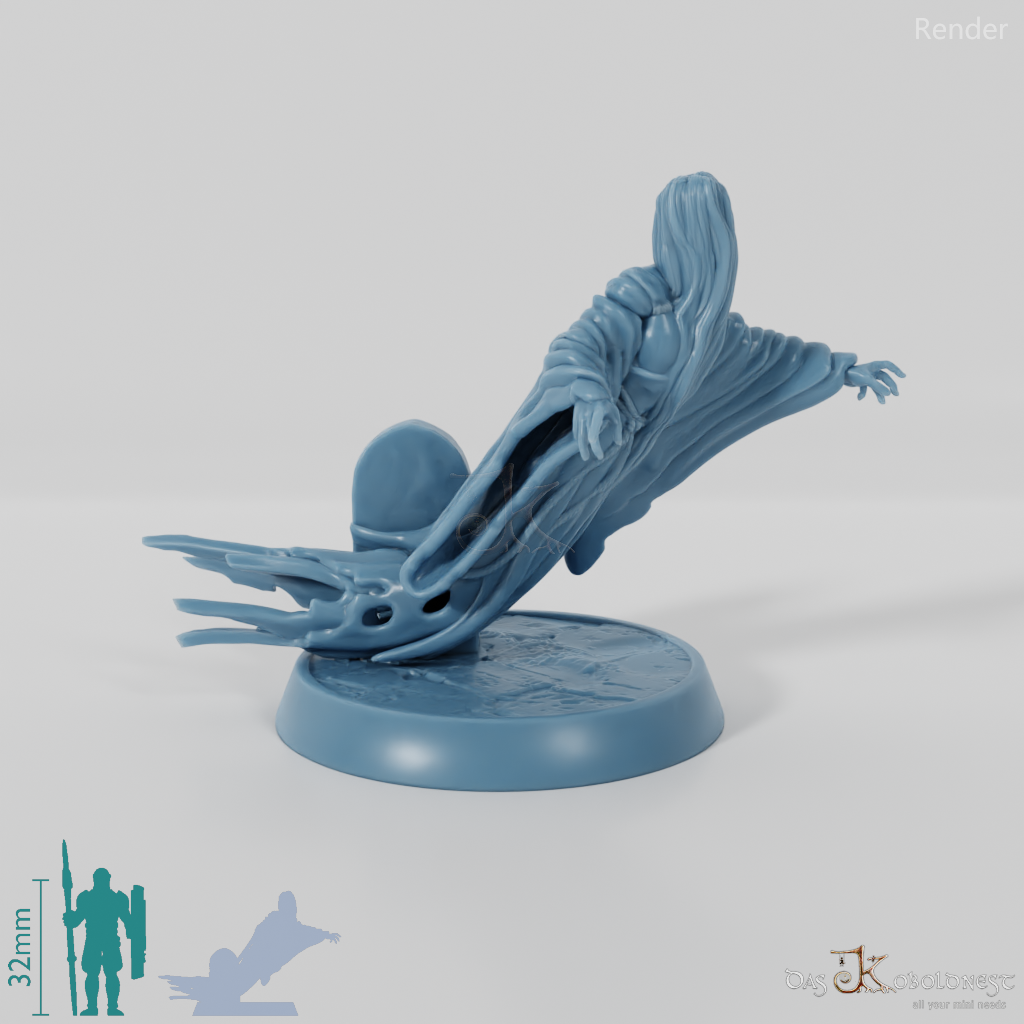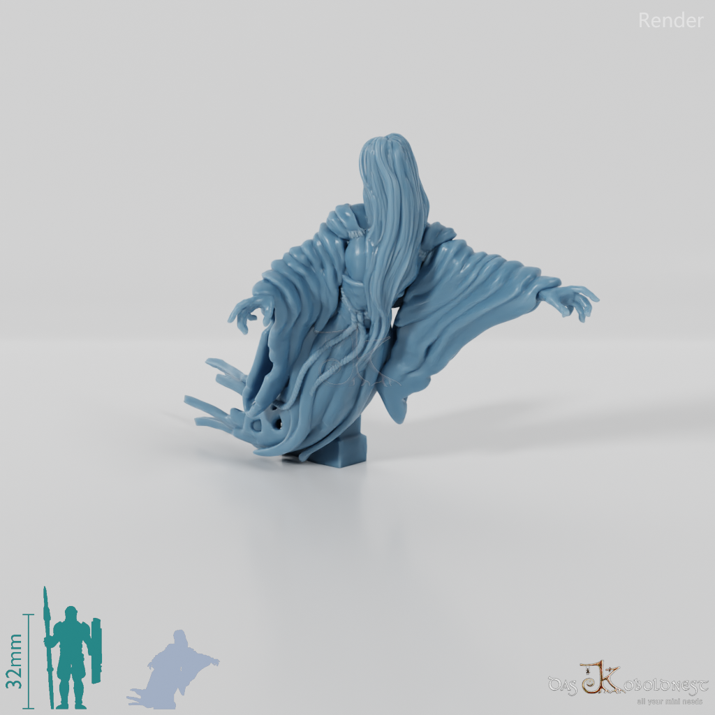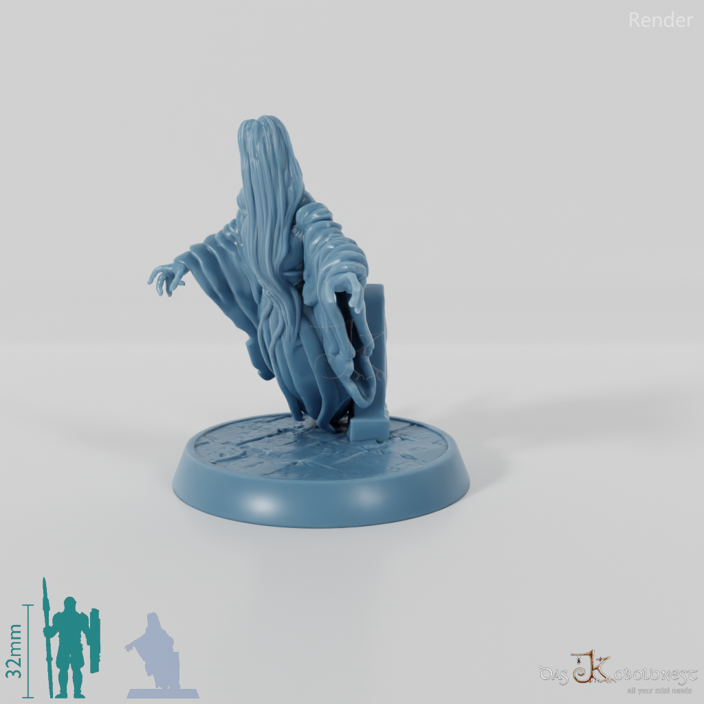 Weiblicher Klagegeist mit langen Haaren, der vor einem Grabstein schwebt.