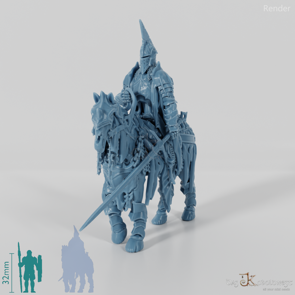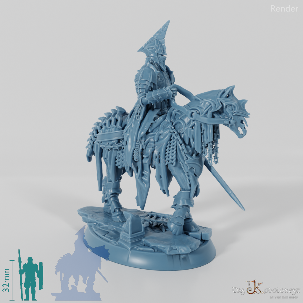 Geist mit massiger Plattenrüstung und großem Zweihandschwert, der auf einem untoten Pferd reitet