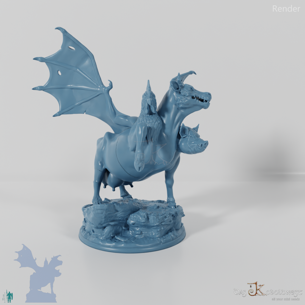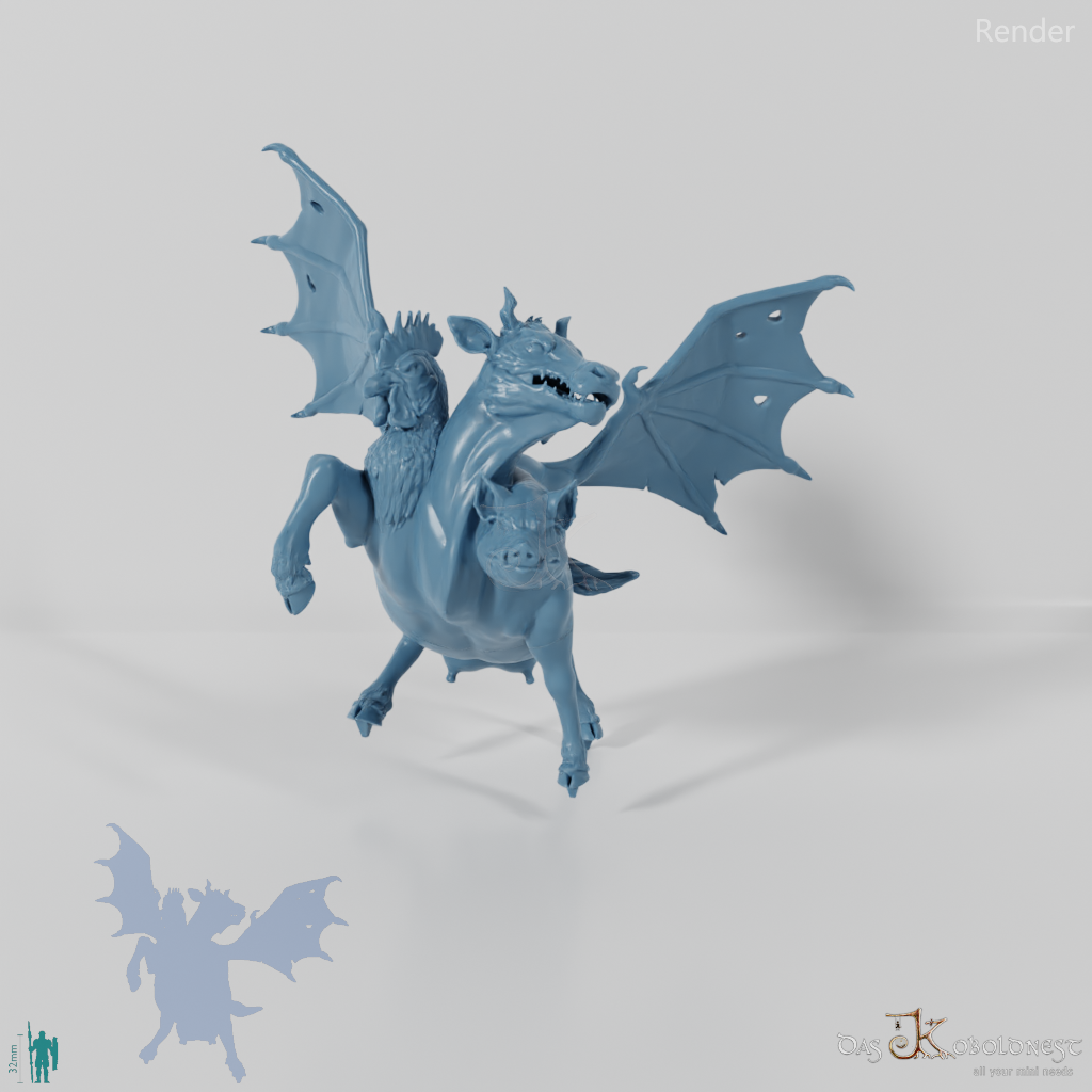 Gewaltige Chimäre mit ledrigen Flügeln, die einen Hahnenkopf, einen Kuhkopf mit spitzen Zähnen und einen Schweinekopf hat
