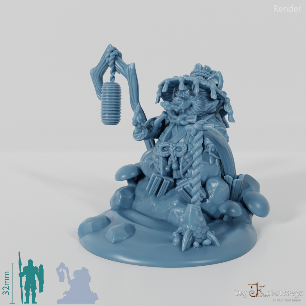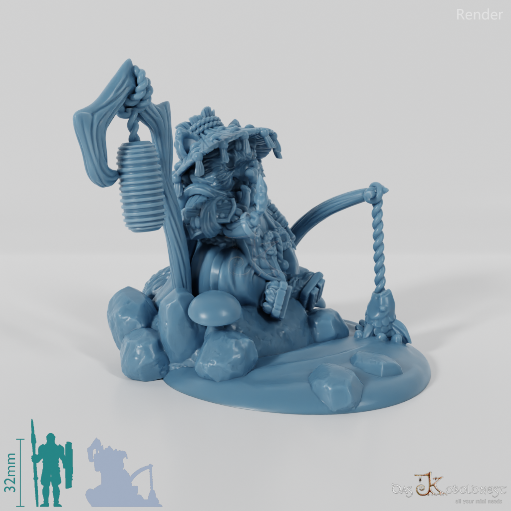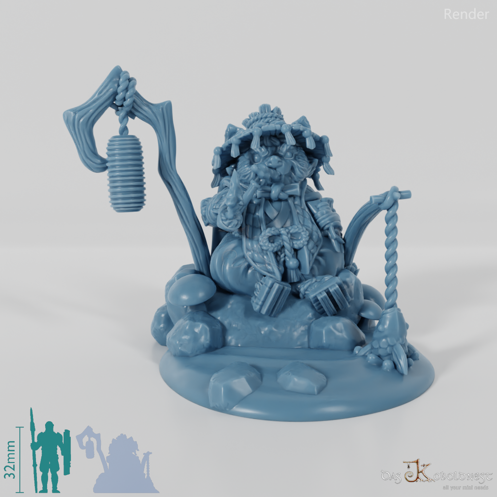 Kleiner Yokai in der Gestalt eines humanoiden Tanuki mit Stab und Laterne, der Menschen als Trickster Streiche spielt oder ihnen hilft