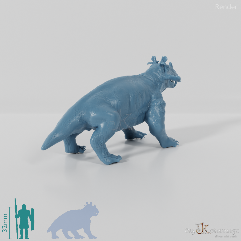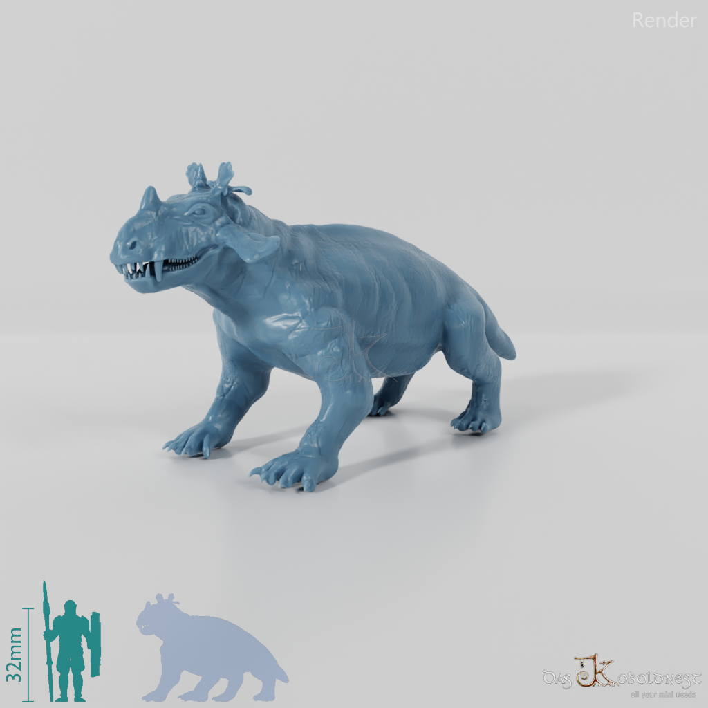 Nilpferdgroßer, prähistorischer Säugetierverwandter mit gedrungenem, kräftigem Körper und gehörntem Schädel