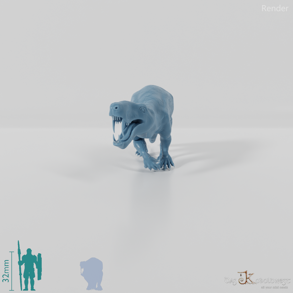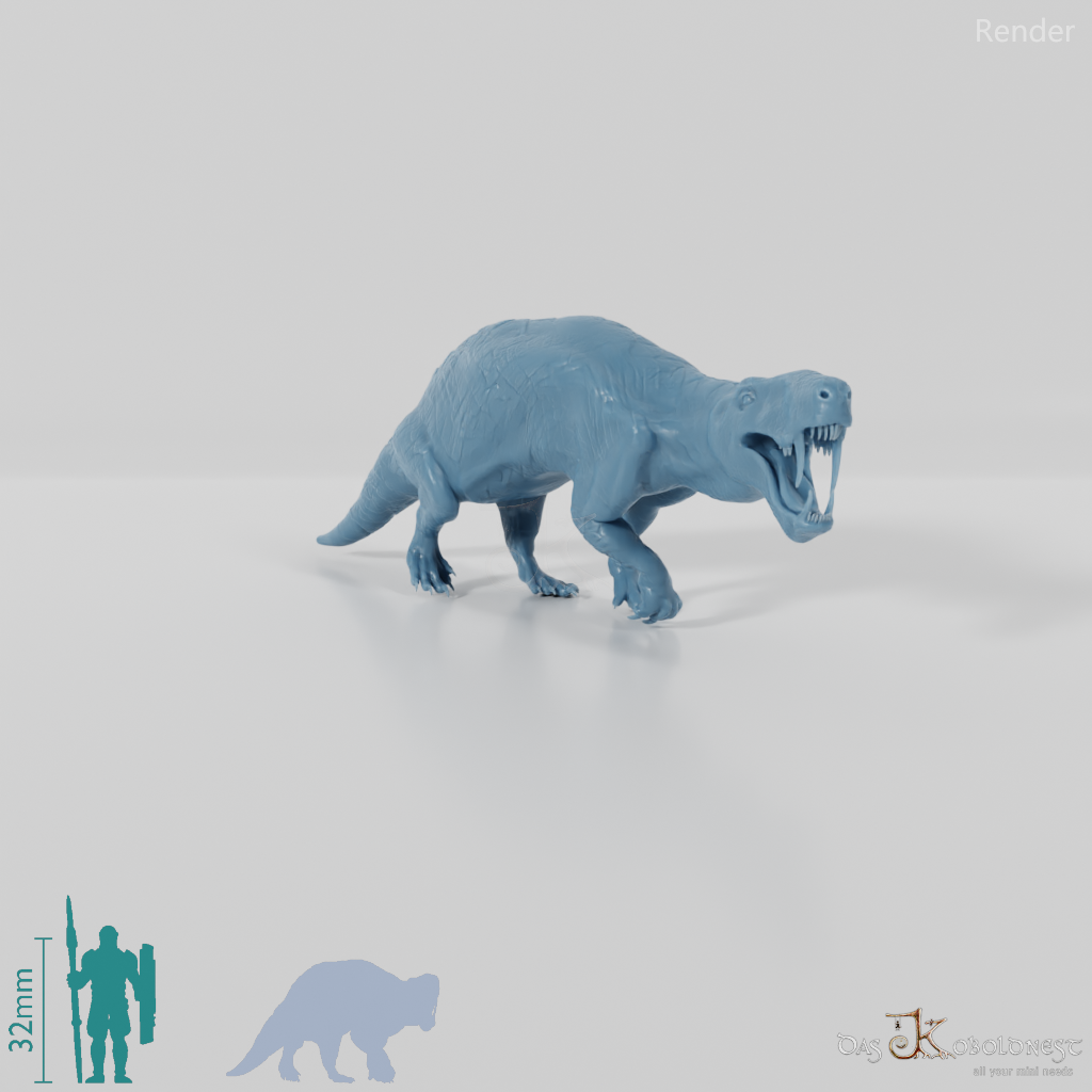 Früher, prähistorischer Säugetiervorläufer mit großem, langgezogenem Schädel und Säbelzähnen