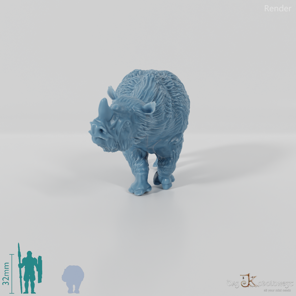 Jungtier eines großen Wollnashorns mit einem großen und einem kleinen Horn und dichtem Fell