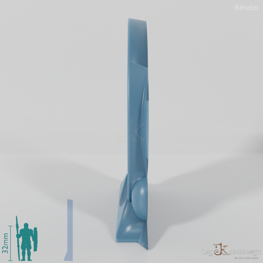Großes, ovales Portal in runenverziertem Rahmen mit flacher Rückseite, die an eine Wand gestellt werden kann. Eignet sich nur als freistehendes Portal, wenn zwei Modelle Rücken an Rücken gestellt/geklebt werden.   Modell: Portal - Miniature Terrain by brimstone326, lizenziert unter CC BY 3.0.