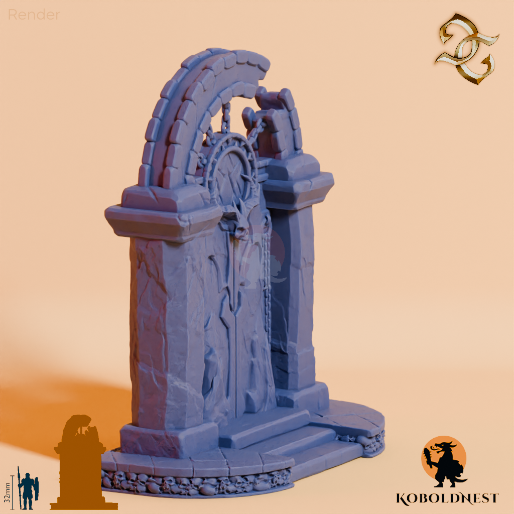 Hohes, in Stein eingelassenes Tor, das von Ketten gehalten wird und mit einem Dämonenschädel verziert ist