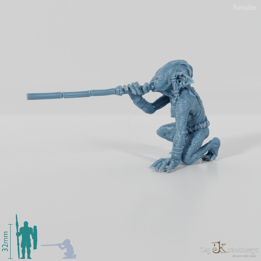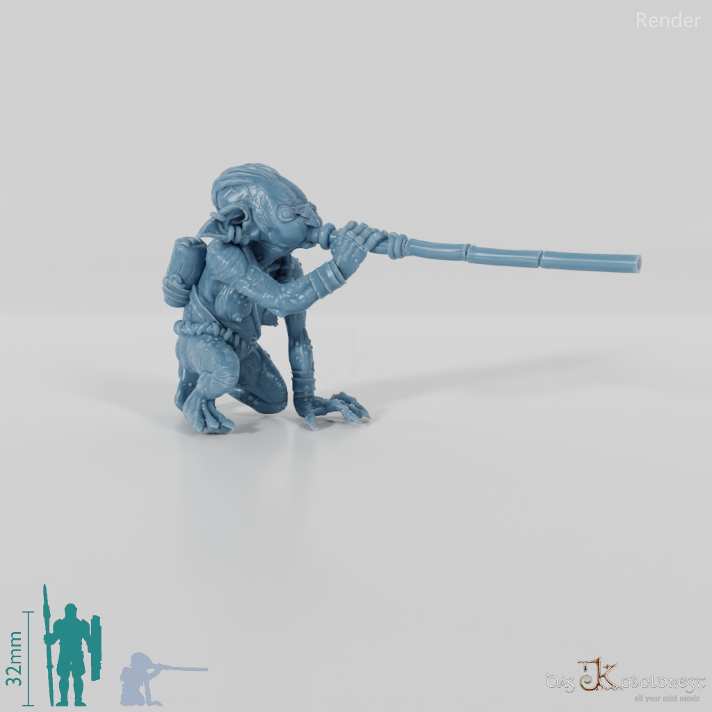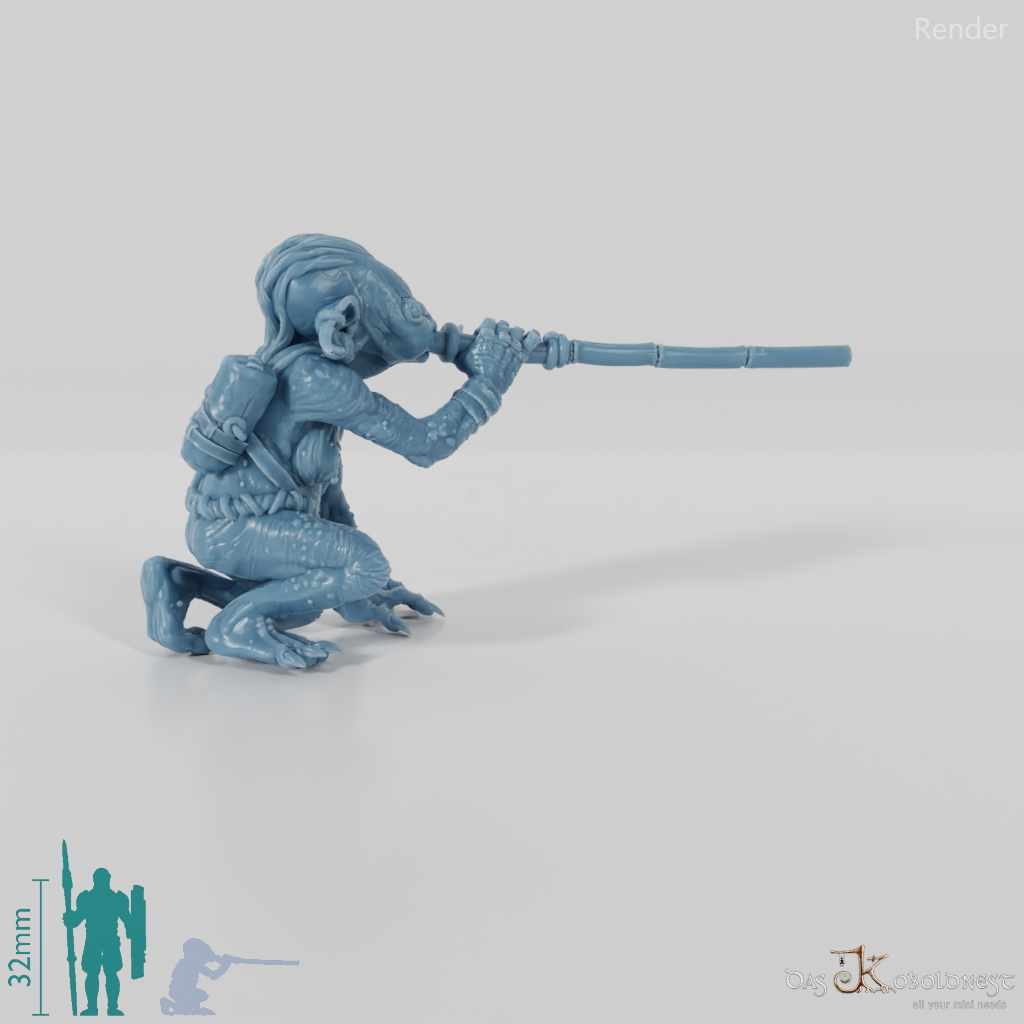Goblinfrau mit dünnem Lendenschurz und runzliger Haut, die kniend ein Blasrohr an den Mund gehoben hält Die Hände des Modells sind separate Einzelteile und beliebig mit den Händen aller Modelle der Jibujanga-Goblins austauschbar.