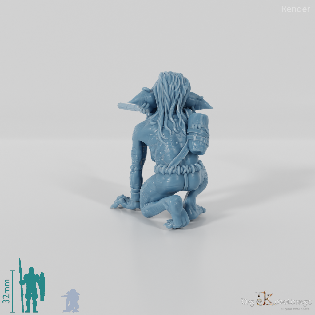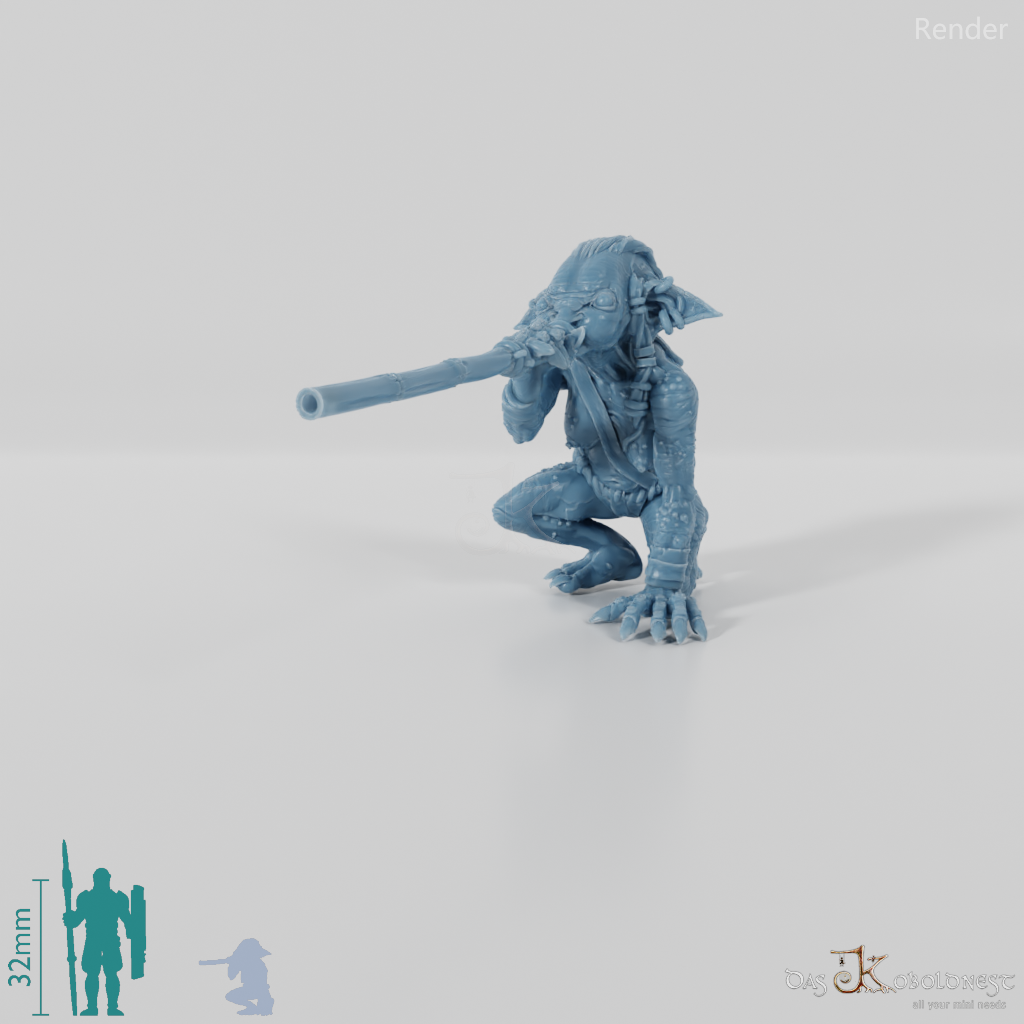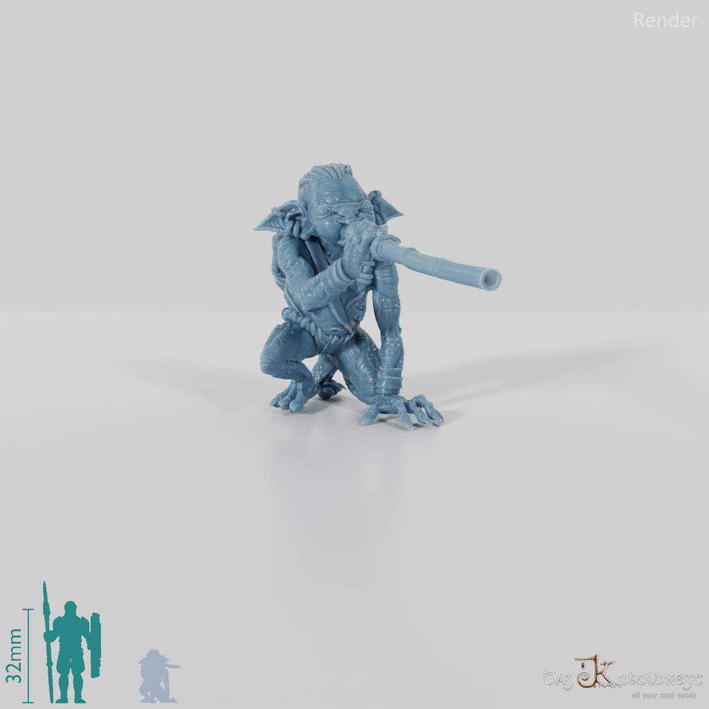 Goblinfrau mit dünnem Lendenschurz und runzliger Haut, die kniend ein Blasrohr an den Mund gehoben hält Die Hände des Modells sind separate Einzelteile und beliebig mit den Händen aller Modelle der Jibujanga-Goblins austauschbar.