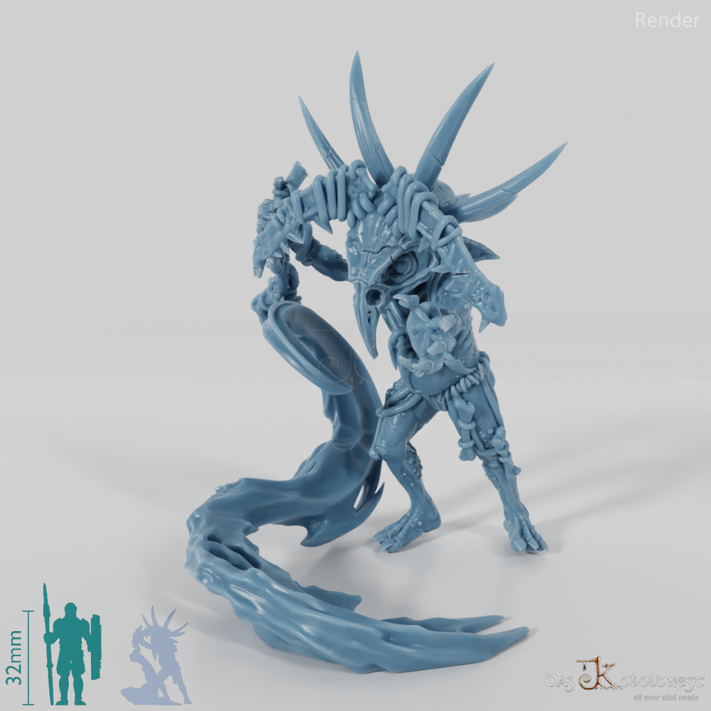 Goblin mit großer Schädelmaske, der einen wirbelnden Zauber wirkt Die Hände des Modells sind separate Einzelteile und beliebig mit den Händen aller Modelle der Jibujanga-Goblins austauschbar.