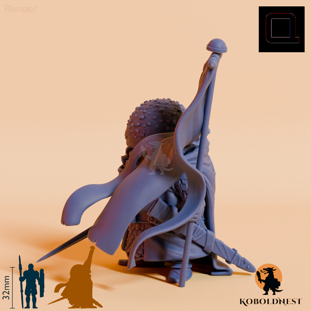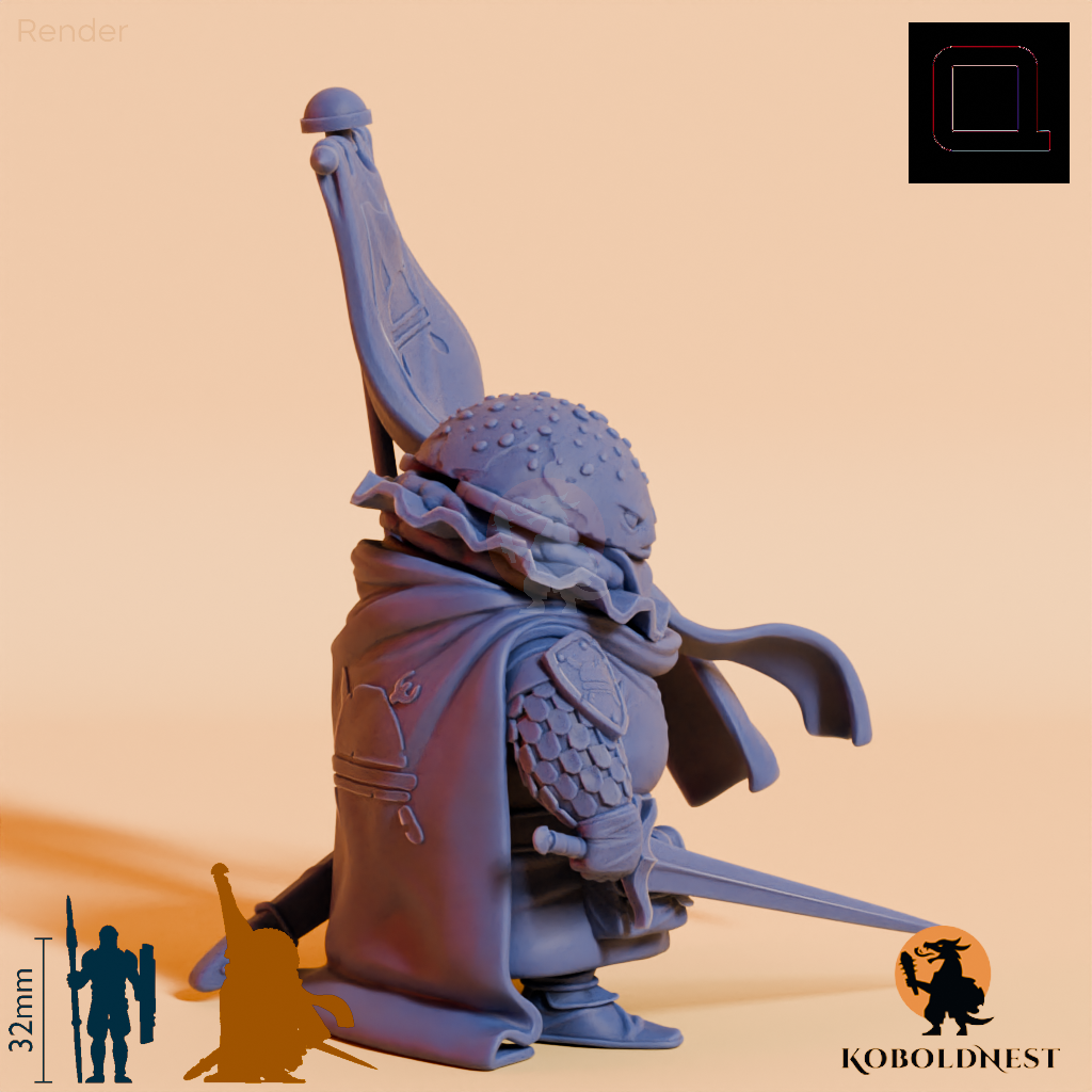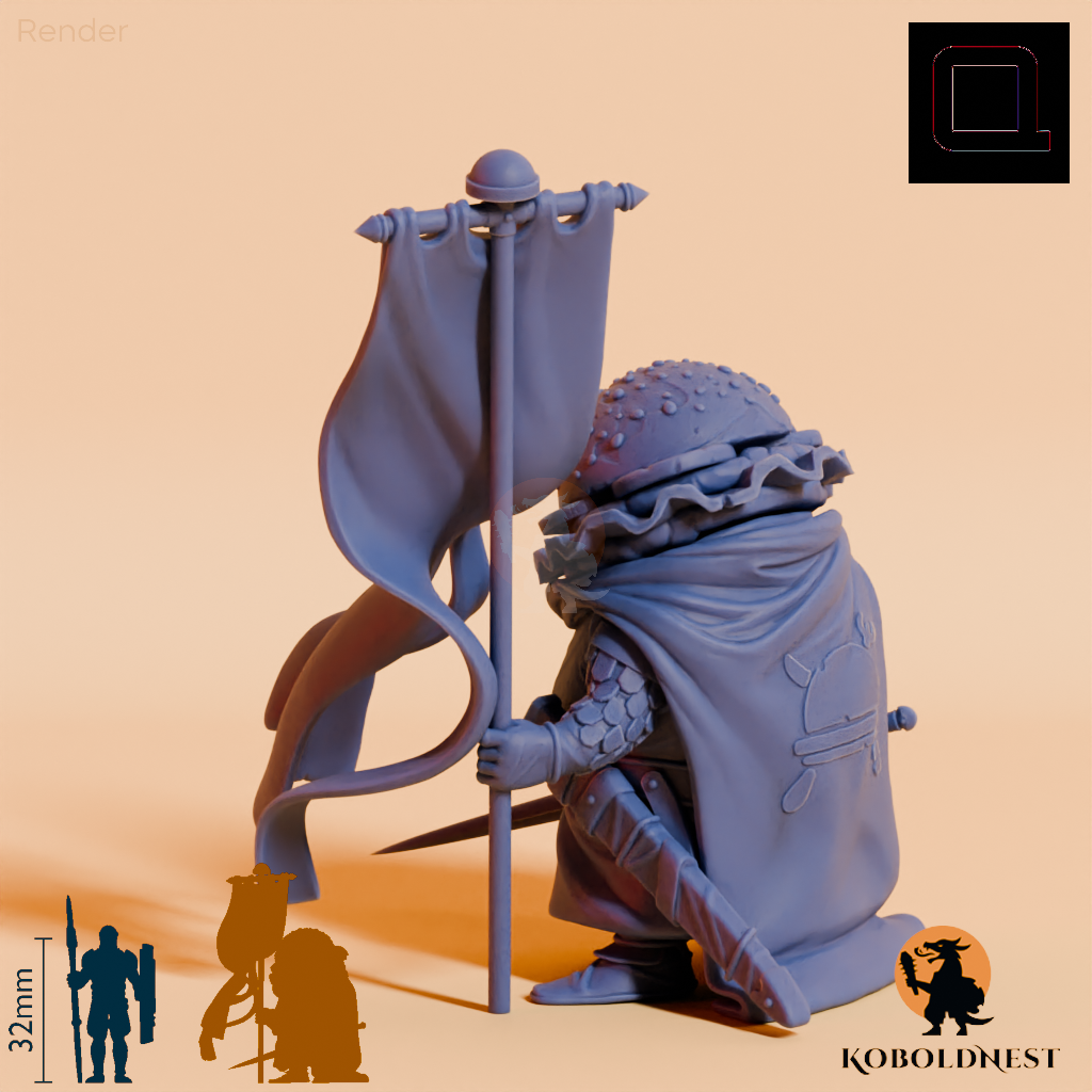 Humanoides Fast Food in Gestalt eines massigen Cheeseburgers mit Lamellenpanzer, der mit einem Schwert bewaffnet ist und ein Banner in die Höhe hält