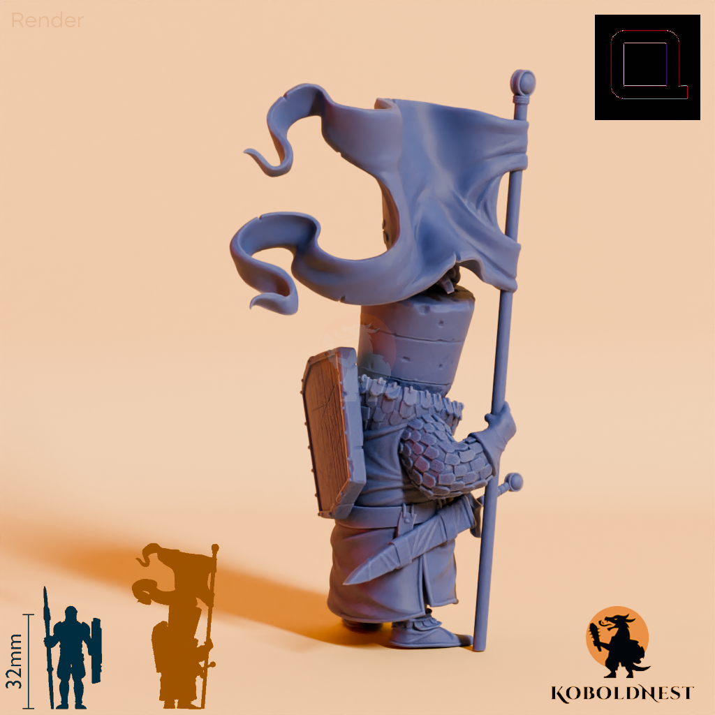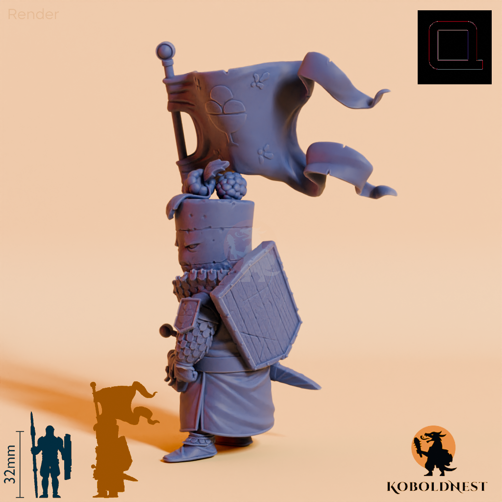 Humanoide Süßspeise in Gestalt eines Schokoladenkuchens, der ein wehendes Banner mit Eisbecherwappen hält und ein Schild auf dem Rücken, sowie ein Schwert an seinem Gürtel trägt