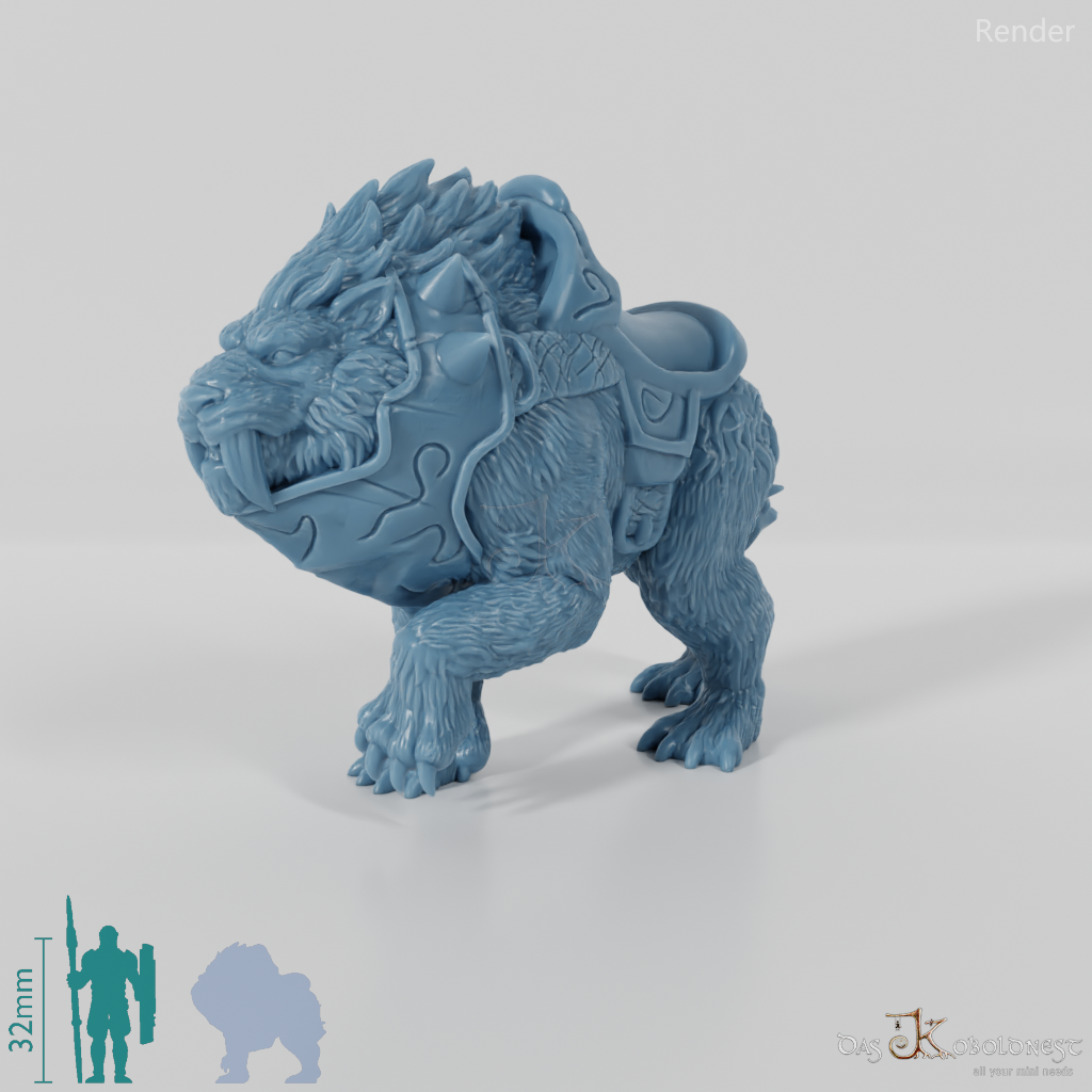 Säbelzahntiger mit dicker Rüstung als Kehlenschutz und Sattel auf dem Rücken.