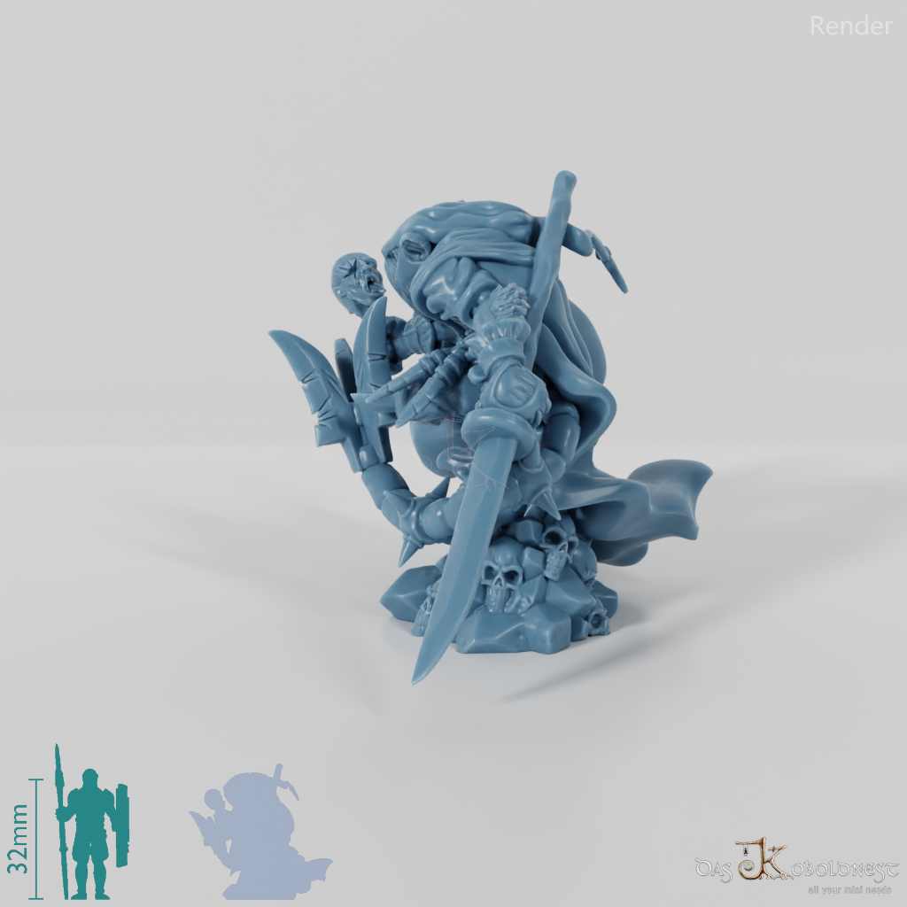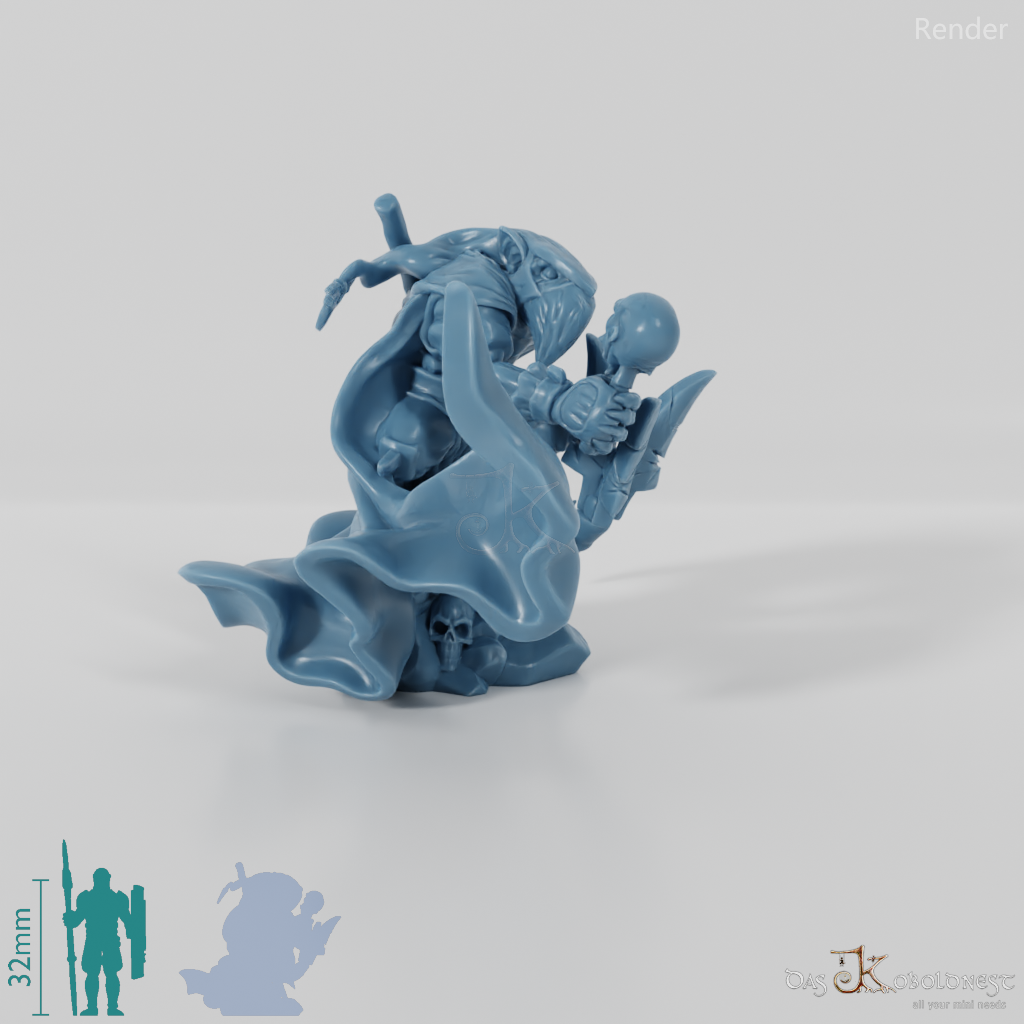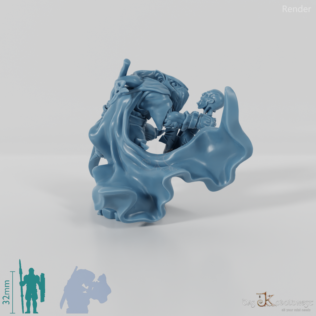 Maskierter Rattenvolk-Assassine der mit wehendem Umhang auf einem Schädelhaufen hockt und einen aufgespießten Kopf in seiner Hand betrachtet