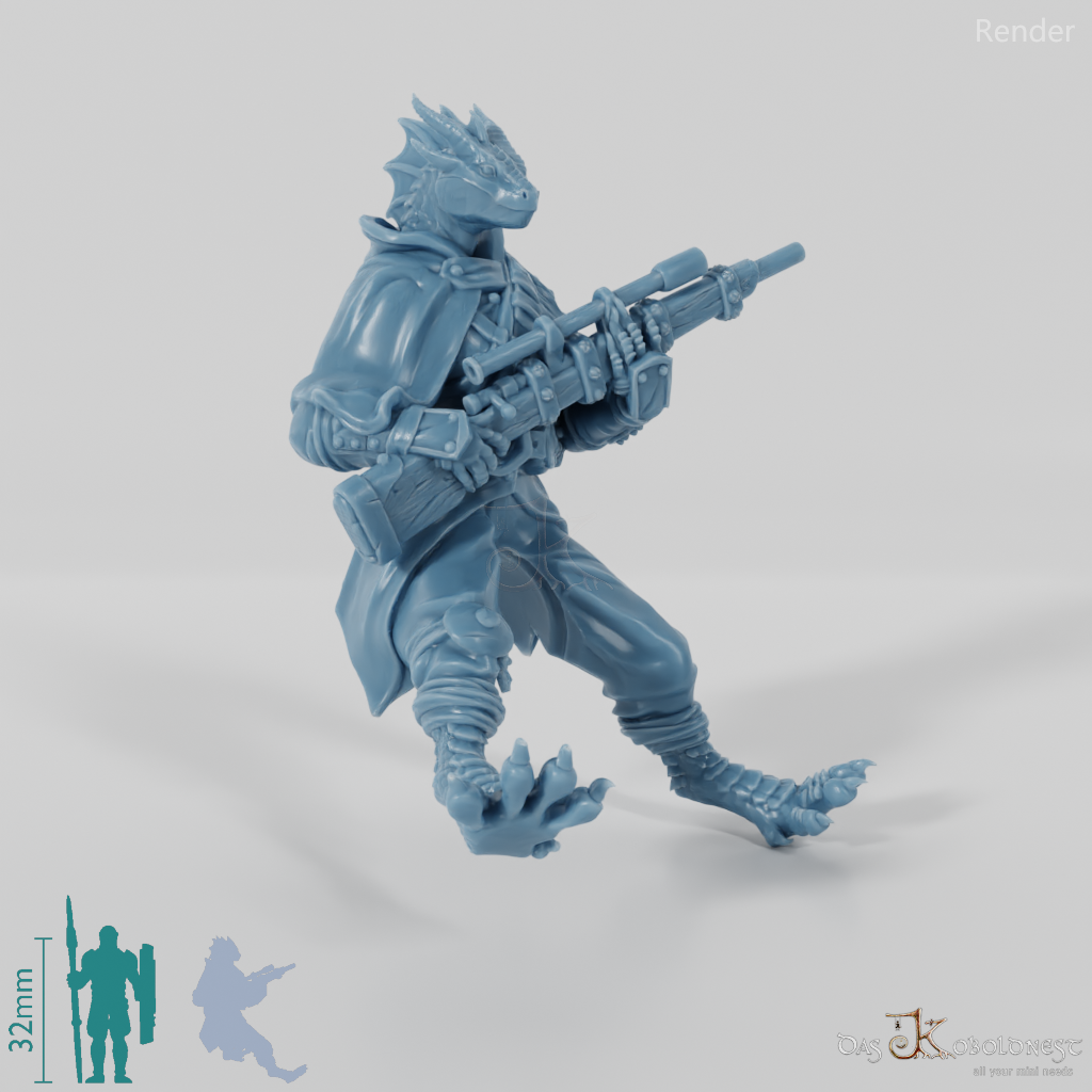 Mit gespreizten Beinen sitzender, humanoider Drache in weiter Kleidung, der mit einem Gewehr bewaffnet ist