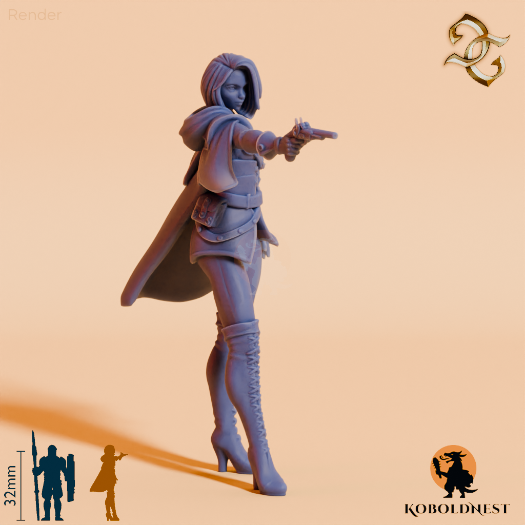 Entschlossen blickende Frau mit wehendem Umhang und kniehohen, geschnürten High-Heels, die einen Revolver schussbereit in der ausgestreckten Hand hält.