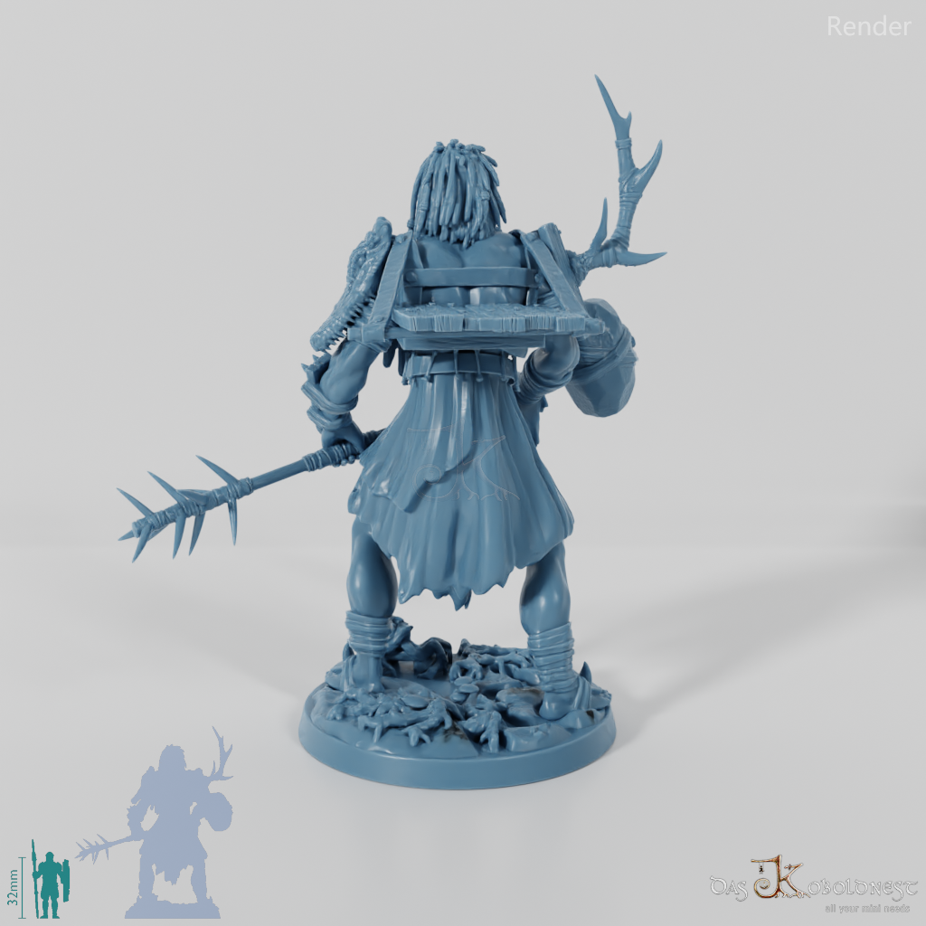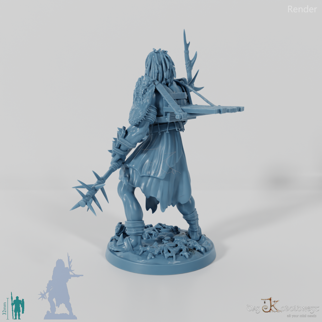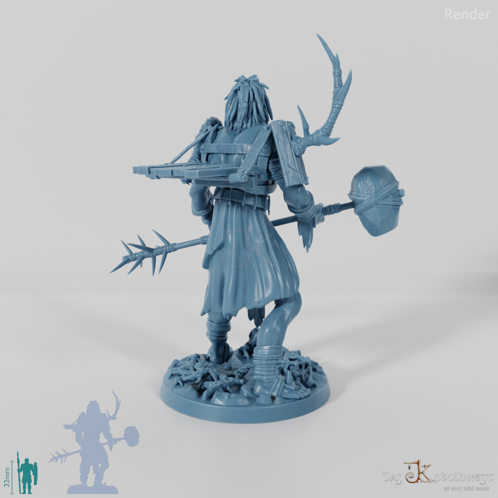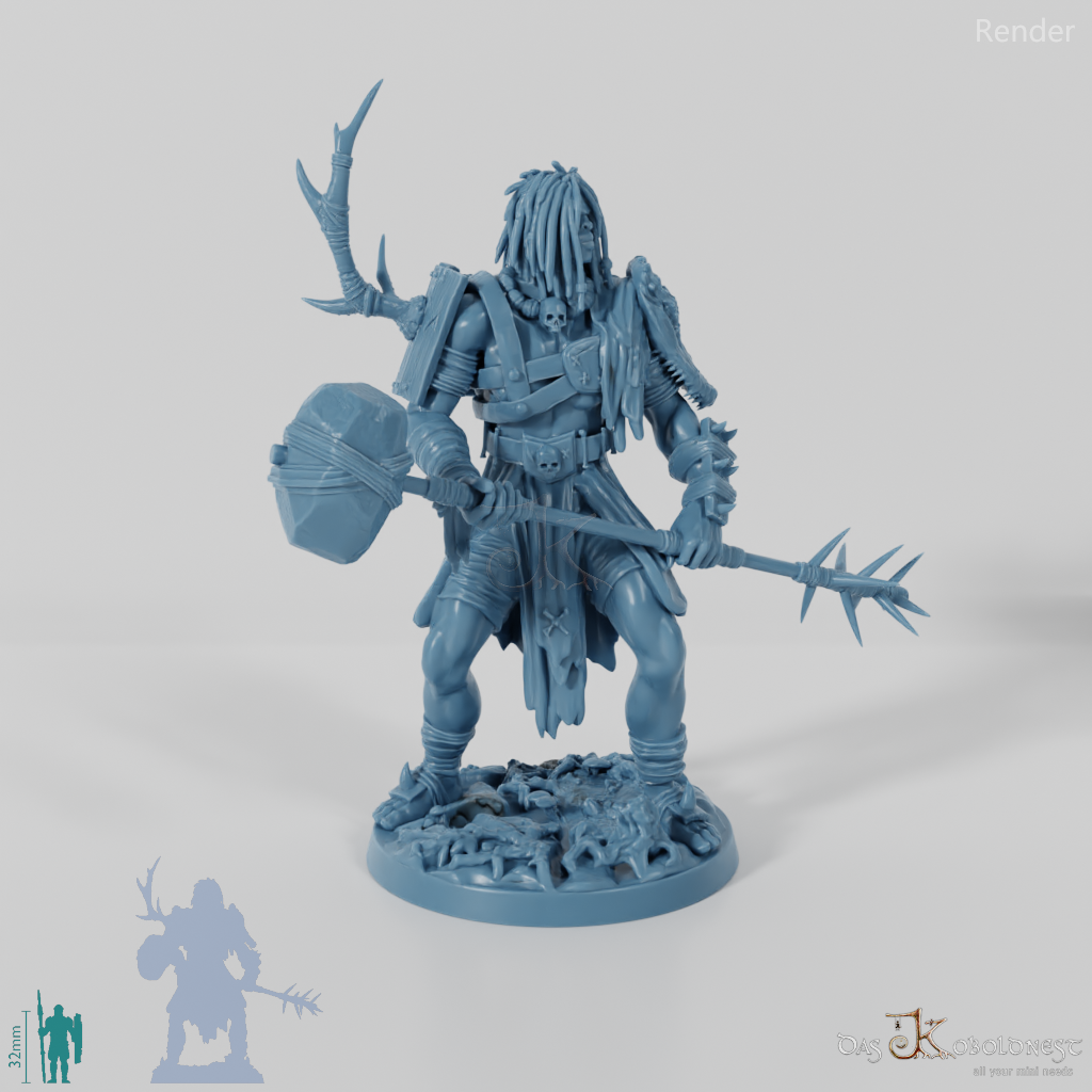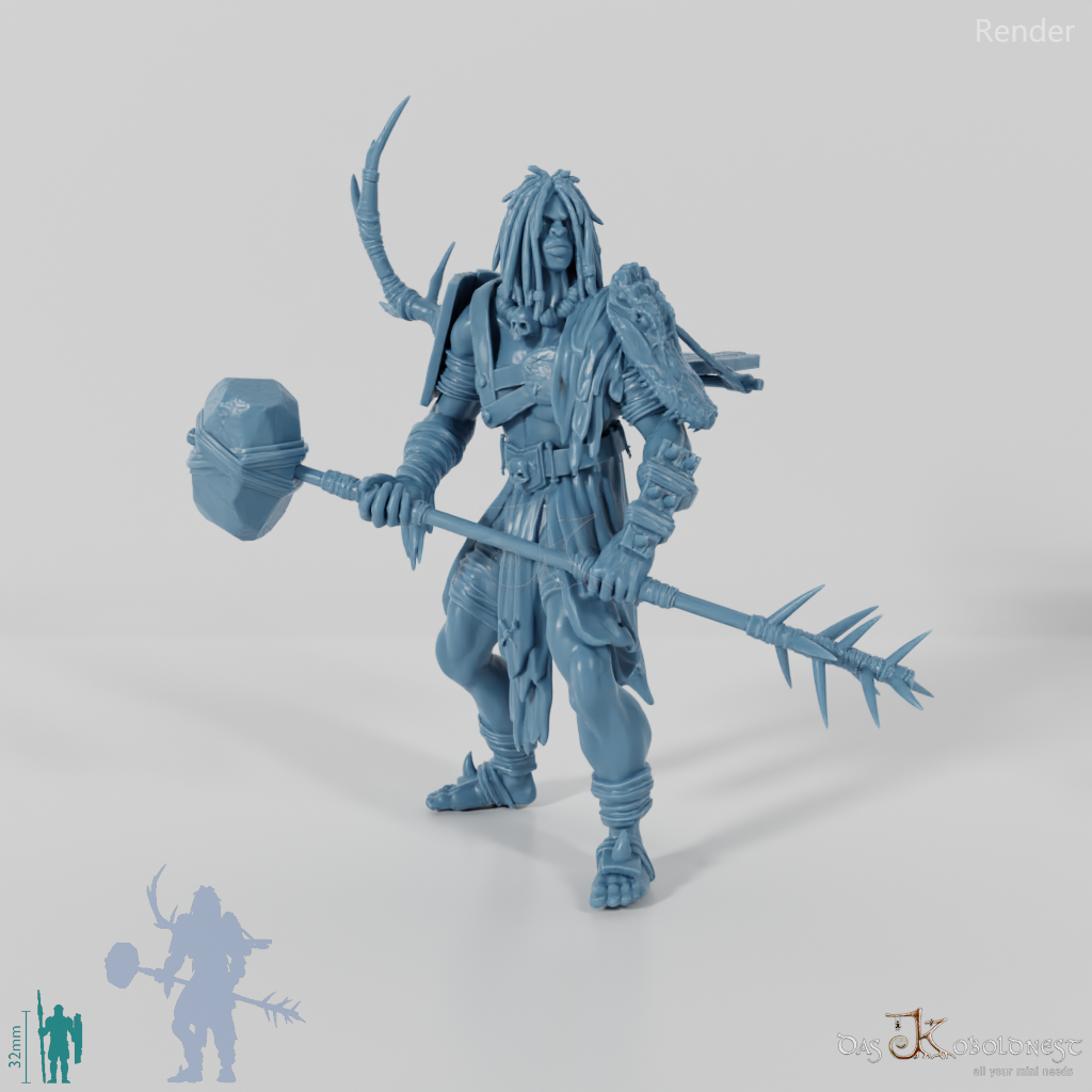 Leicht gerüsteter Riese mit Dreadlocks, der mit einem großen Steinhammer bewaffnet ist und eine Holzplattform auf dem Rücken hat