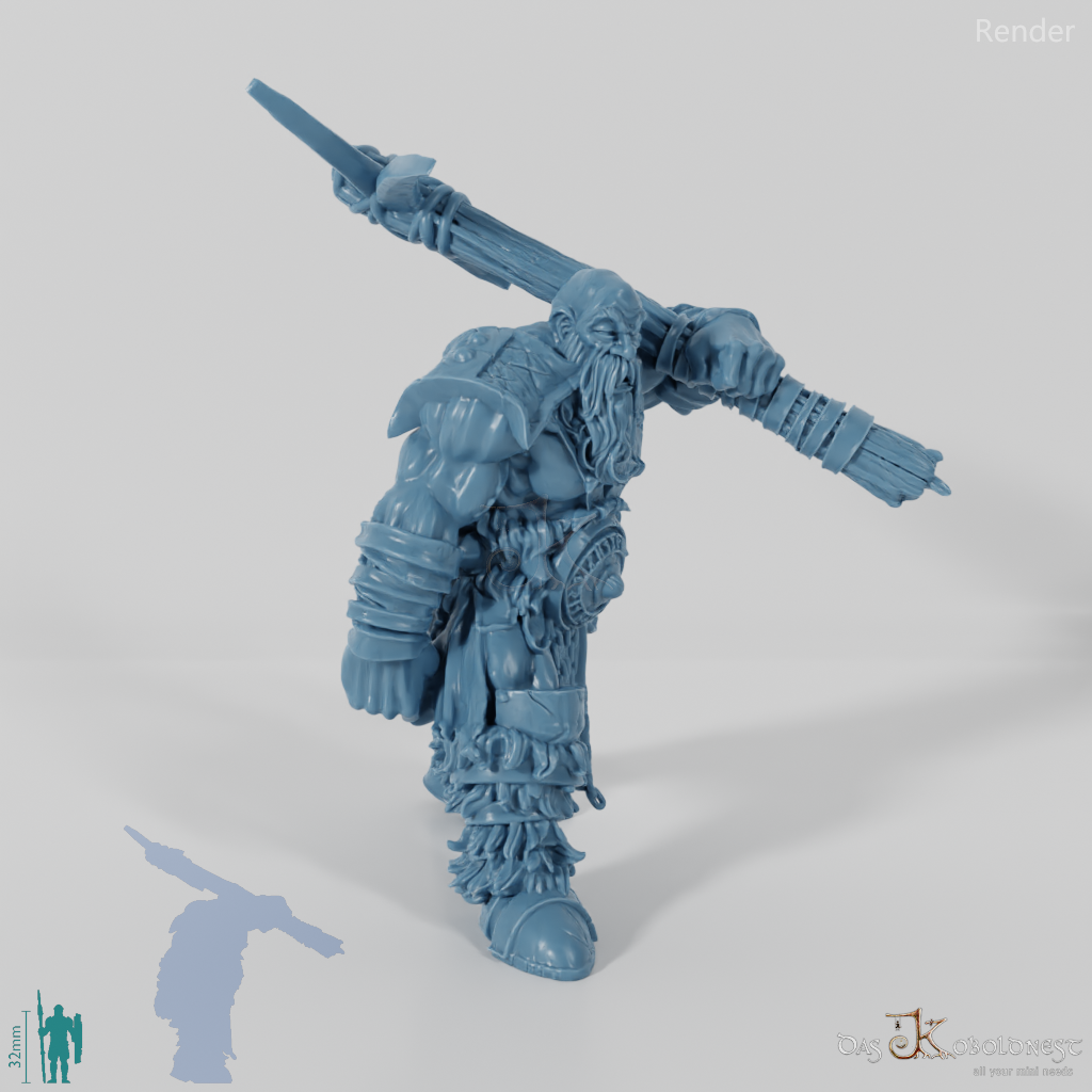 Mit Fellen und grober Metallrüstung bewehrter Riese