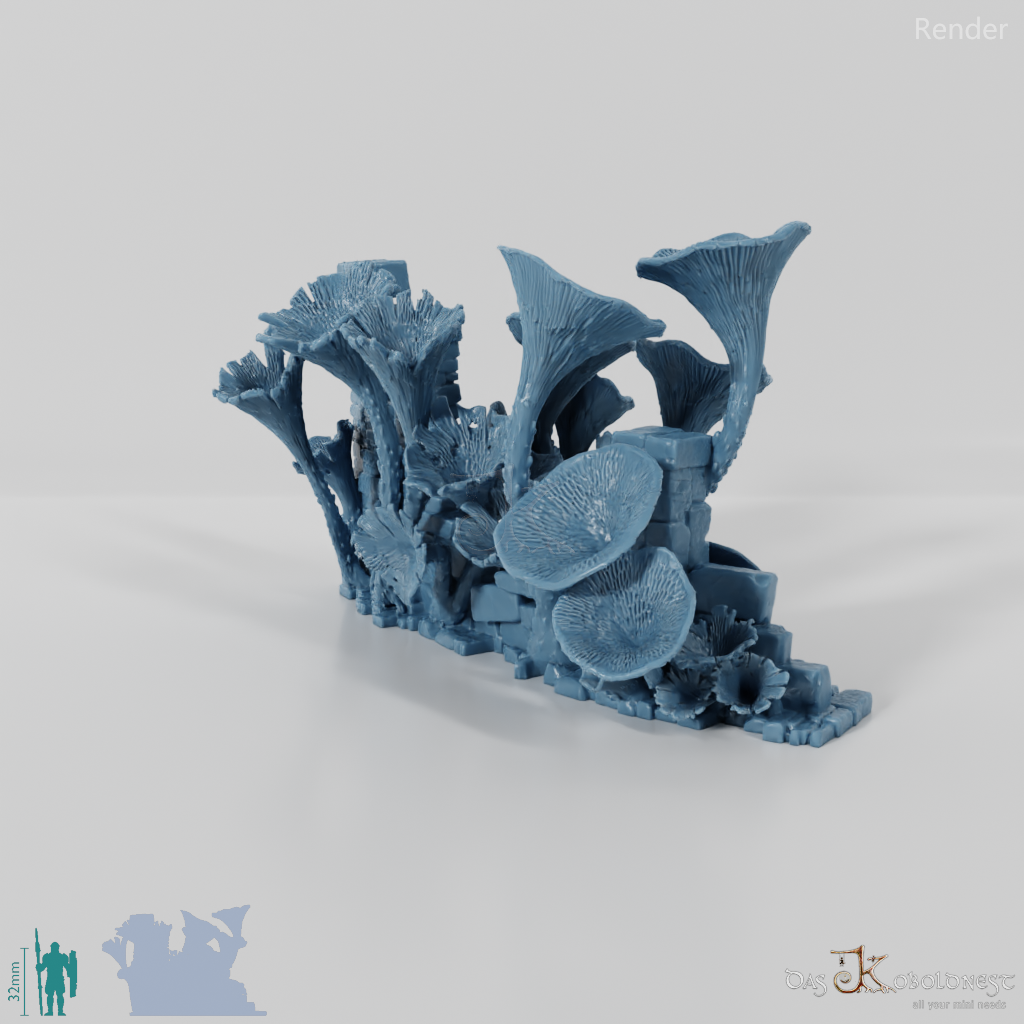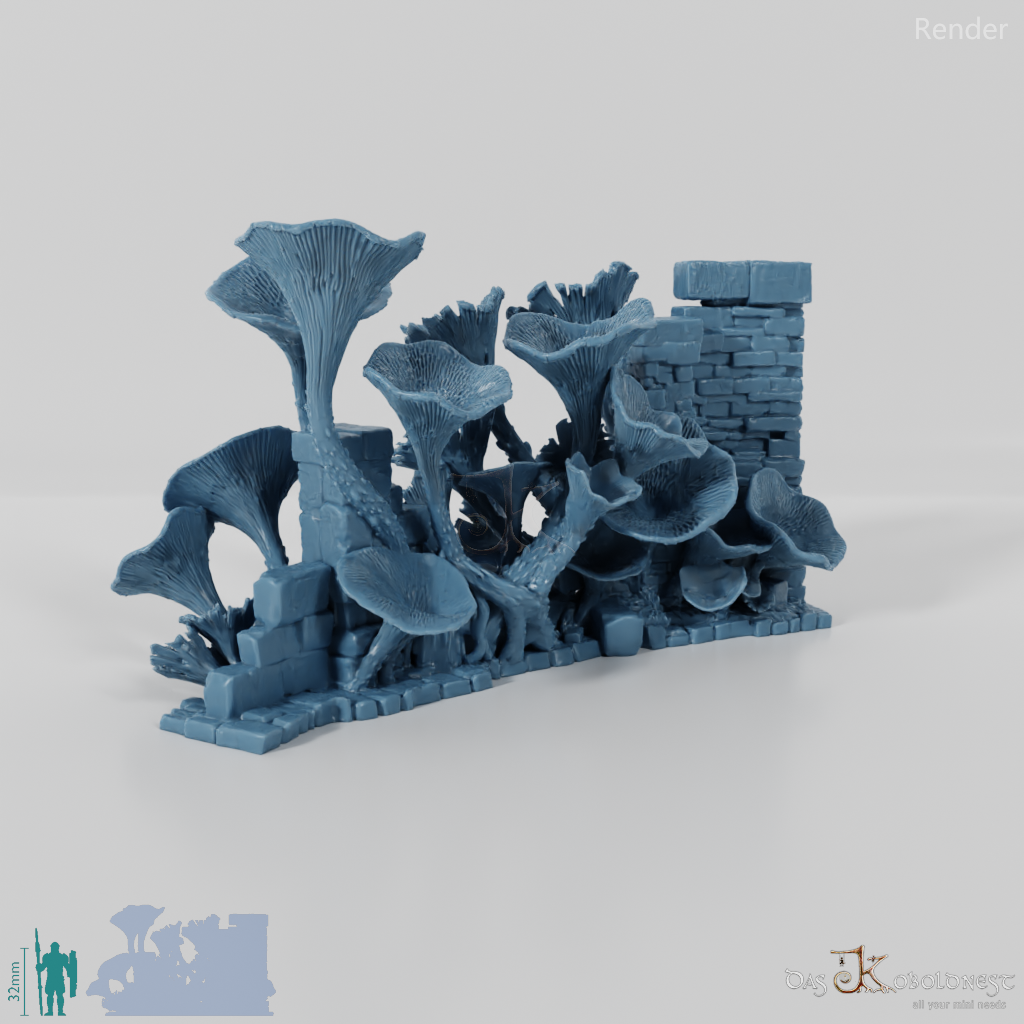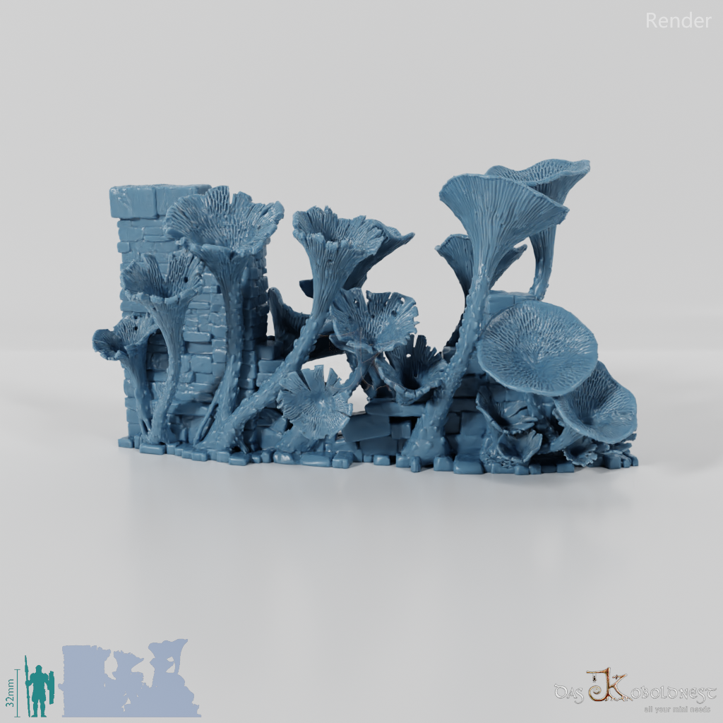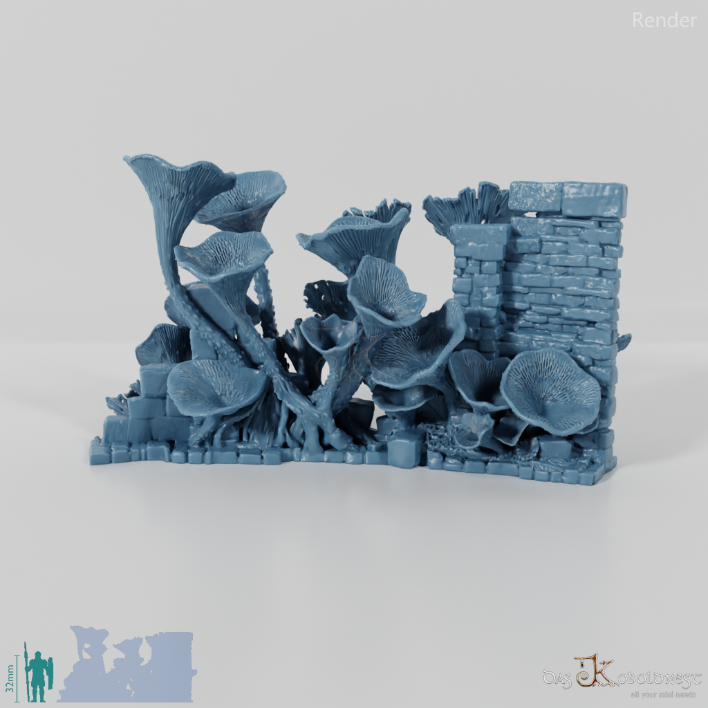 Gemauerte Überreste eines Bauwerks, die mit Riesenpilzen bewachsen sind