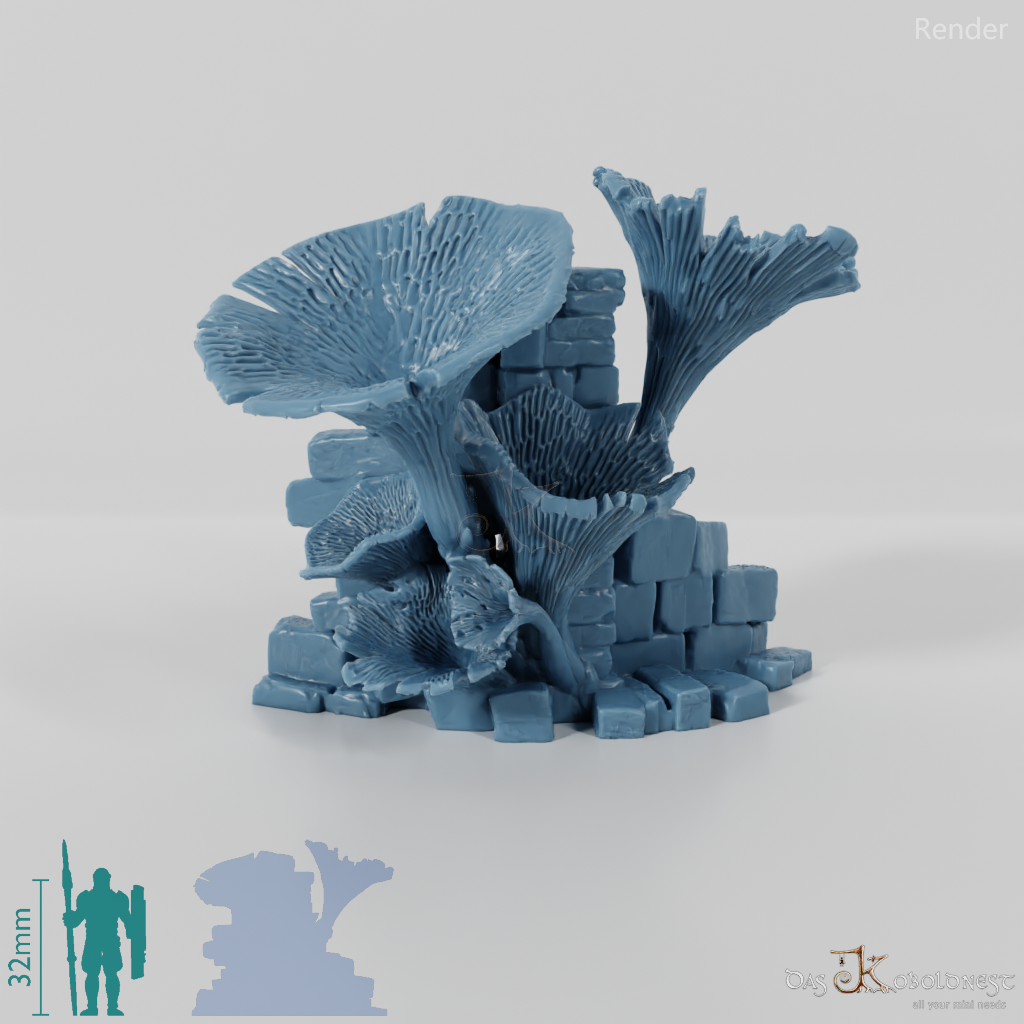 Gemauerte Überreste eines Bauwerks, die mit Riesenpilzen bewachsen sind