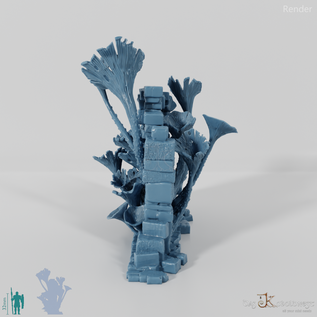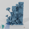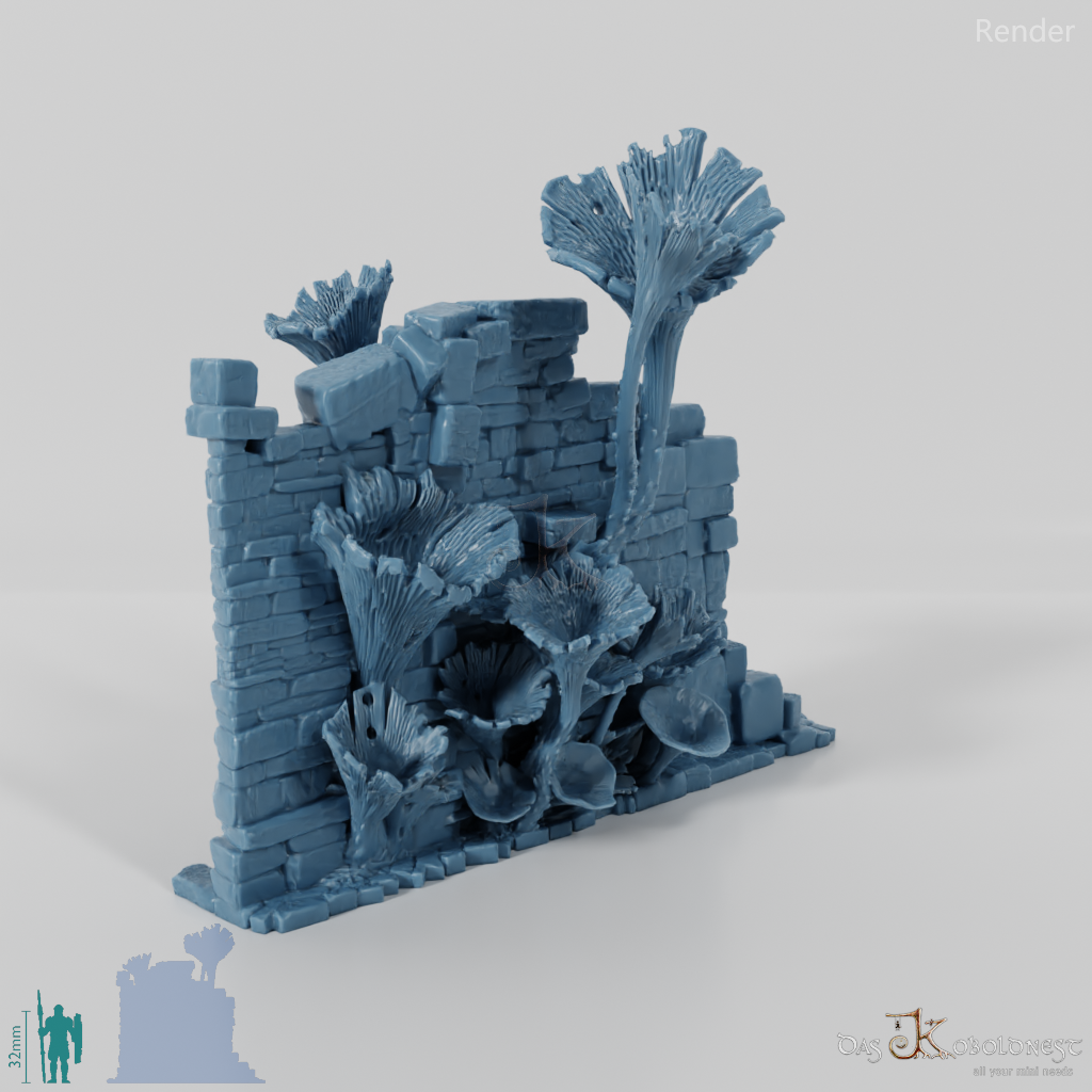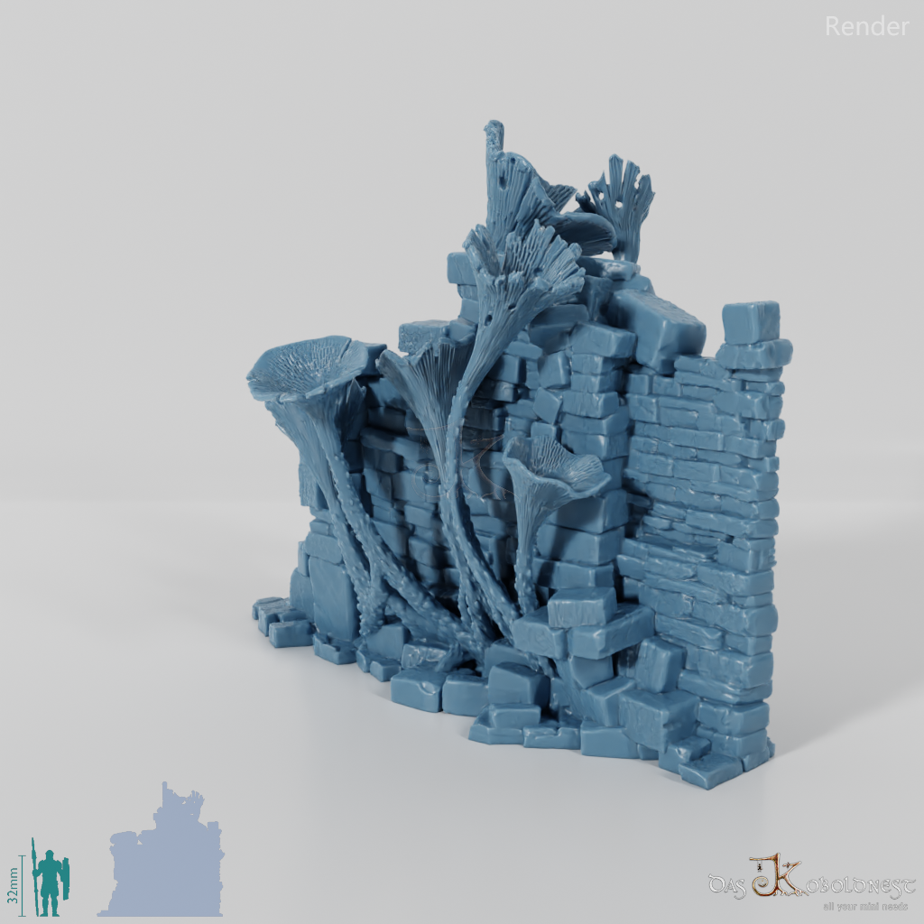 Gemauerte Überreste eines Bauwerks, die mit Riesenpilzen bewachsen sind