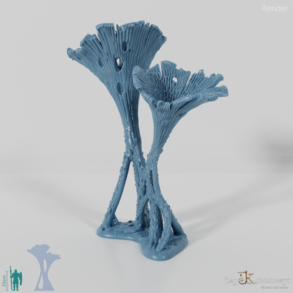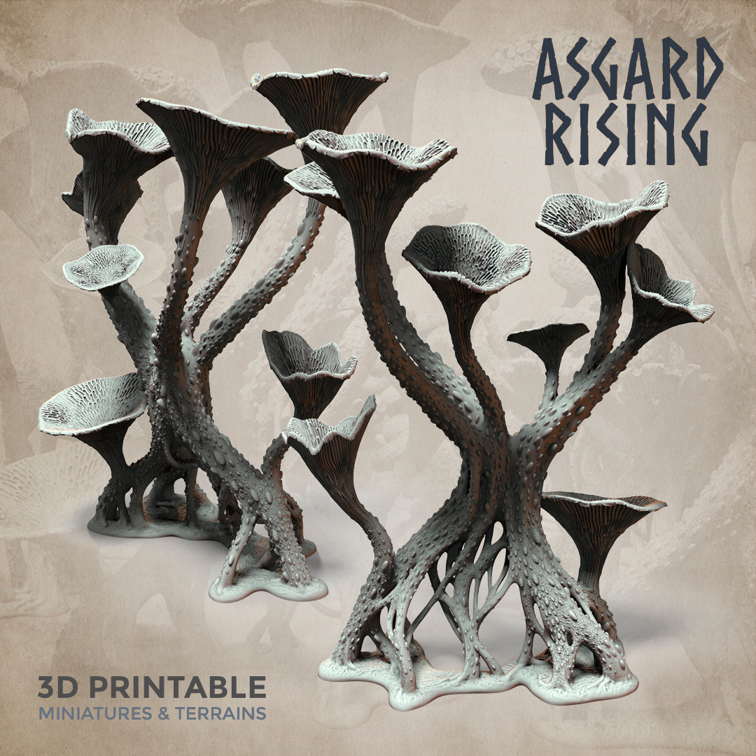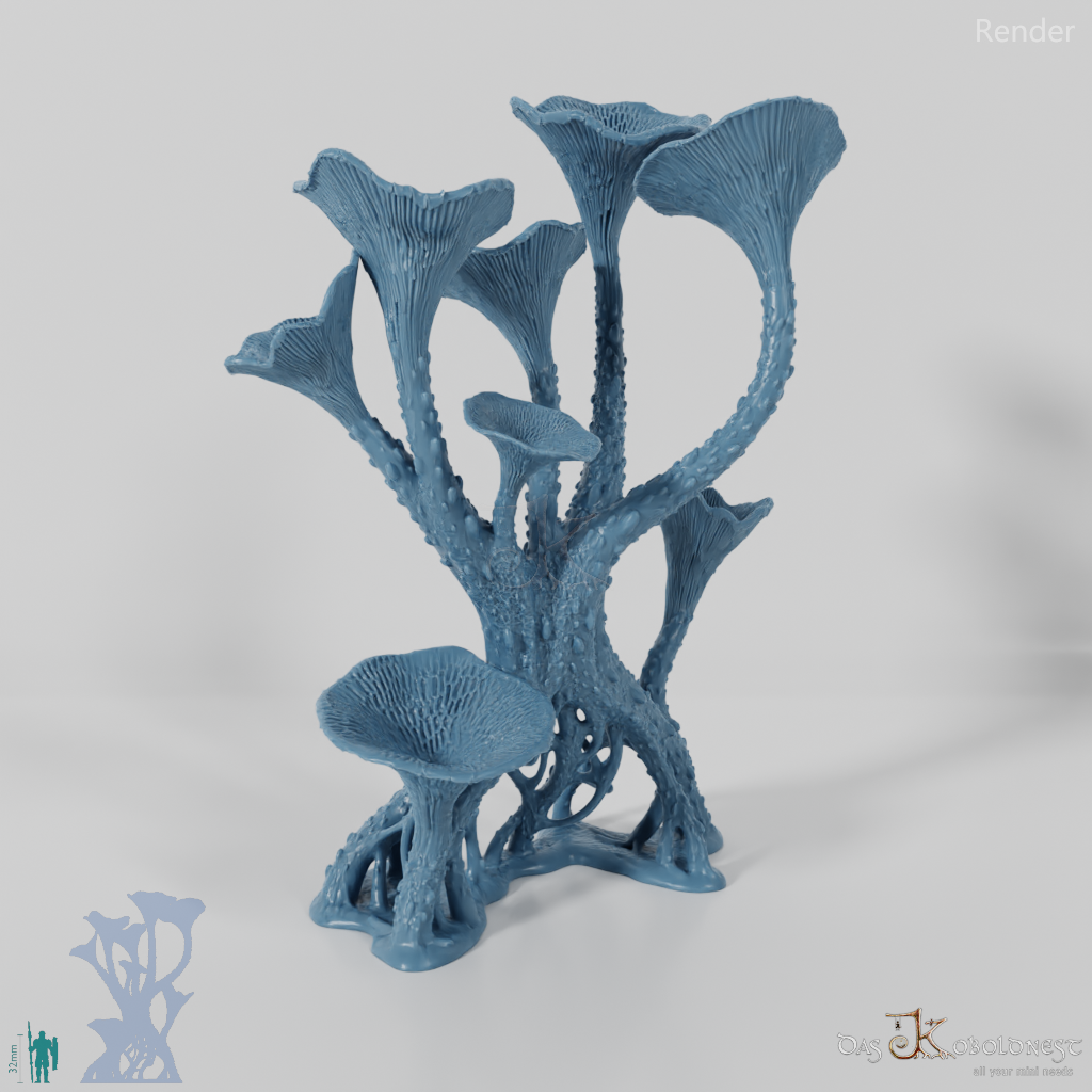 Schlanke, verästelte Riesenpilze mit trichterförmigen Kappen, die hoch in den Himmel ragen.