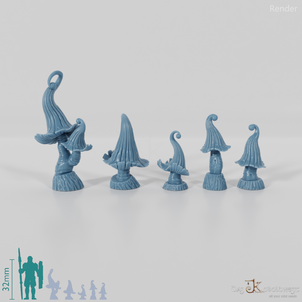 Die Auswahl 'Komplettset (Groß)' beinhaltet alle fünf großen Einzelmodelle. Die Auswahl 'Komplettset (Klein)' beinhaltet alle fünf Modelle, jedoch im Vergleich zu den Einzelmodellen deutlich verkleinert, sodass sie als kleine Pflanzen zur Base- oder Dioramagestaltung verwendet werden können.