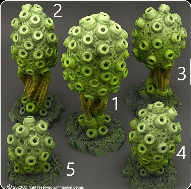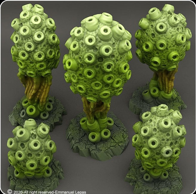 Die Auswahl 'Komplettset (Groß)' beinhaltet alle fünf großen Einzelmodelle. Die Auswahl 'Komplettset (Klein)' beinhaltet alle fünf Modelle, jedoch im Vergleich zu den Einzelmodellen deutlich verkleinert, sodass sie als kleine Pflanzen zur Base- oder Dioramagestaltung verwendet werden können.