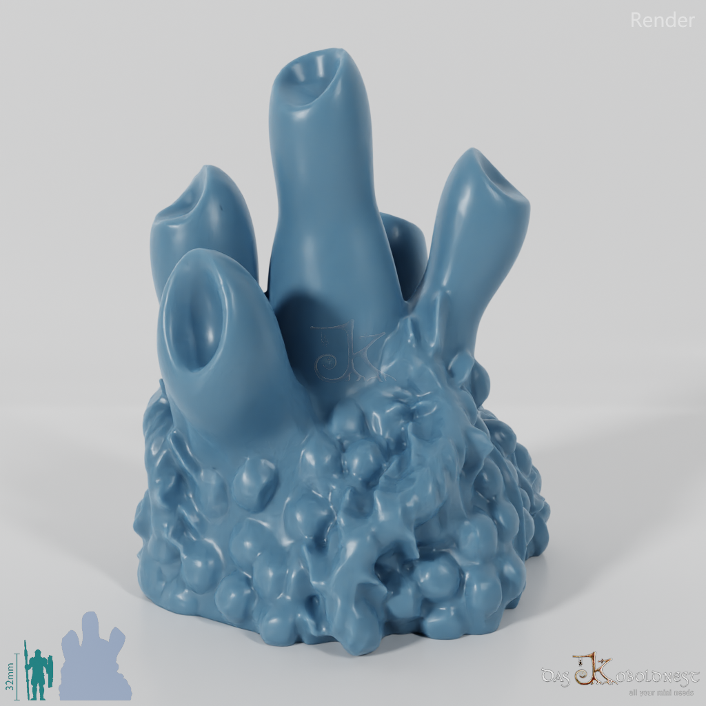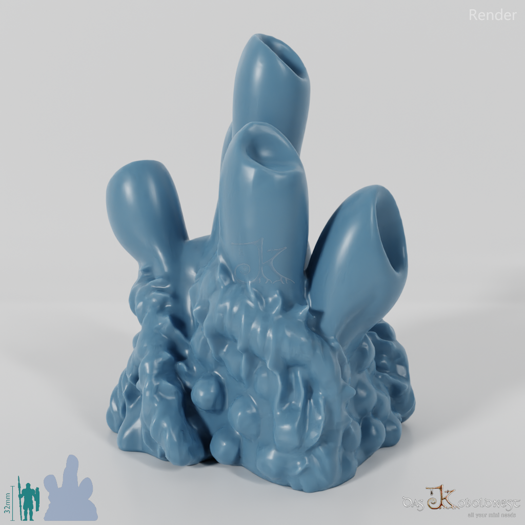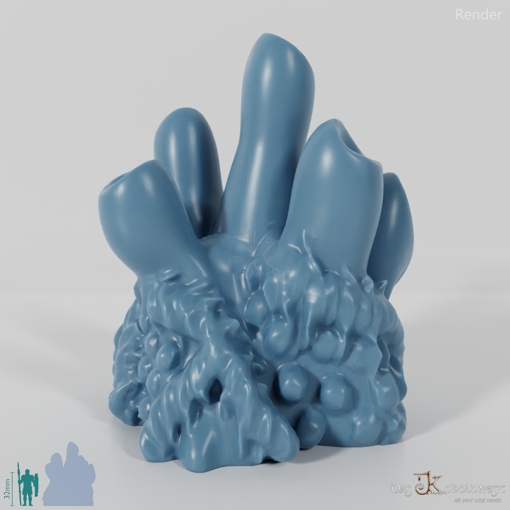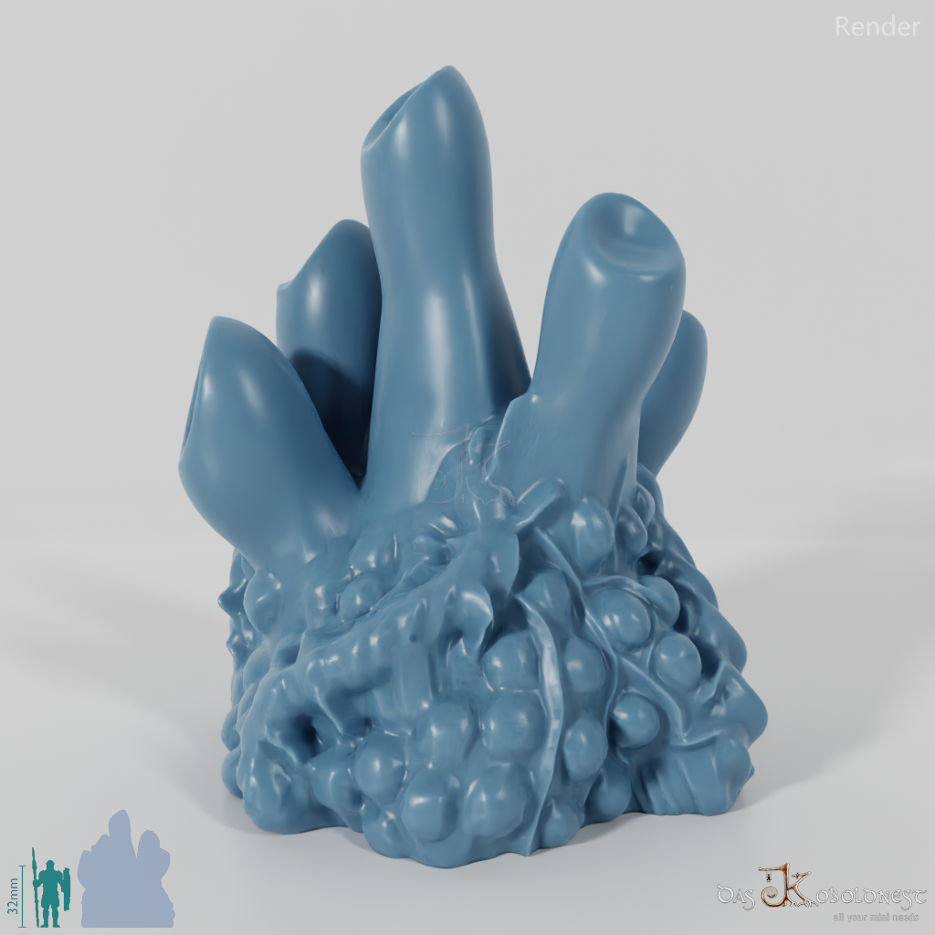 Röhrenförmige Fruchtkörper, die aus einer unförmigen Masse herausragen.